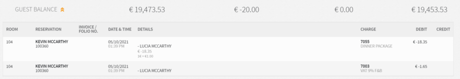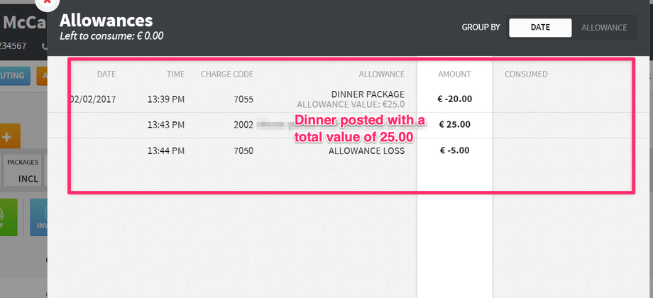 Allowance overage is posted in the event a guest consumed more than the allowance value. The remaining amount will be posted to the guest’s bill.