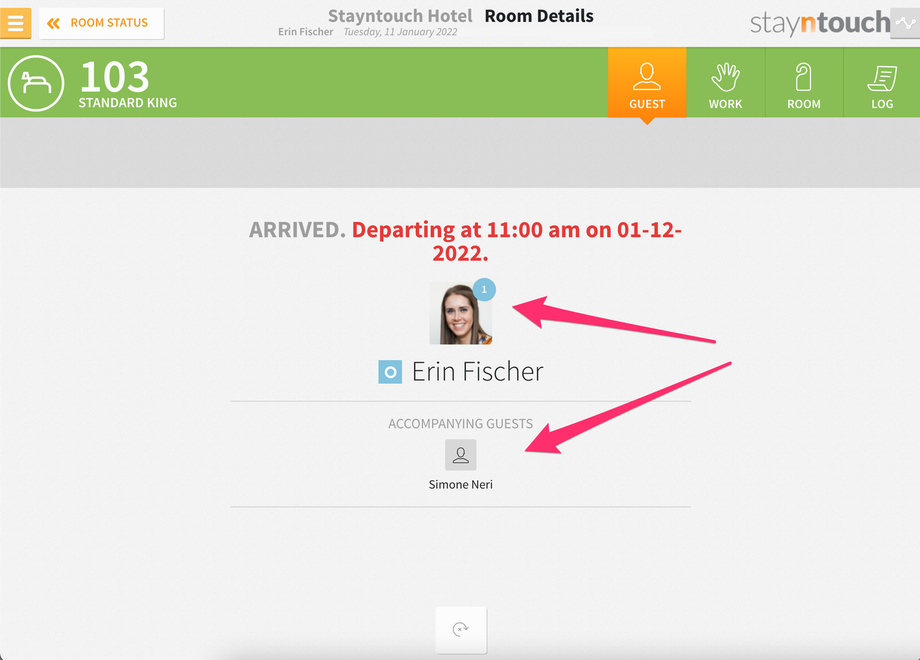 From the GUEST tab in Housekeeping > Room Status > Select Room > Room Details, we now display both the primary guest and accompanying guest details. Both the primary and accompanying guest details include the guest name and guest avatar.
