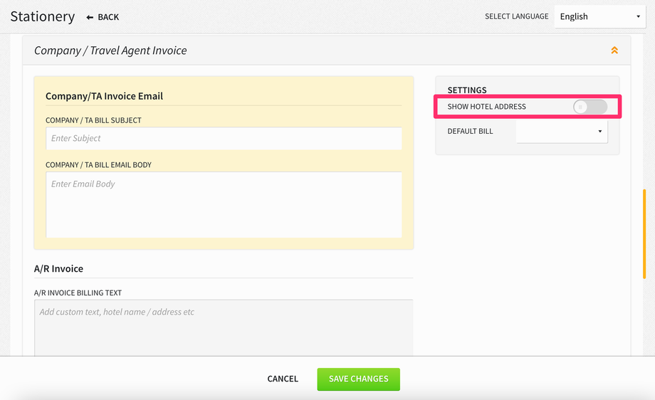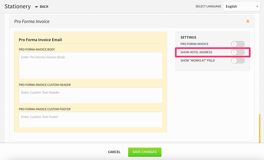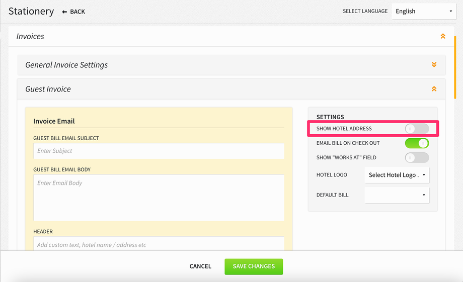 When the internal QR code functionality is enabled for a property, the PMS will print a QR code with the Hotel Tax ID and Hotel VAT Registration Number; however, if the property does not want to print the hotel address details on their invoices and switches OFF the SHOW HOTEL ADDRESS toggle in Settings > Hotel & Staff > Stationery > Invoices, the Hotel Tax ID and Hotel VAT Registration Number will not appear along with the QR code. This applies to print and email invoices.