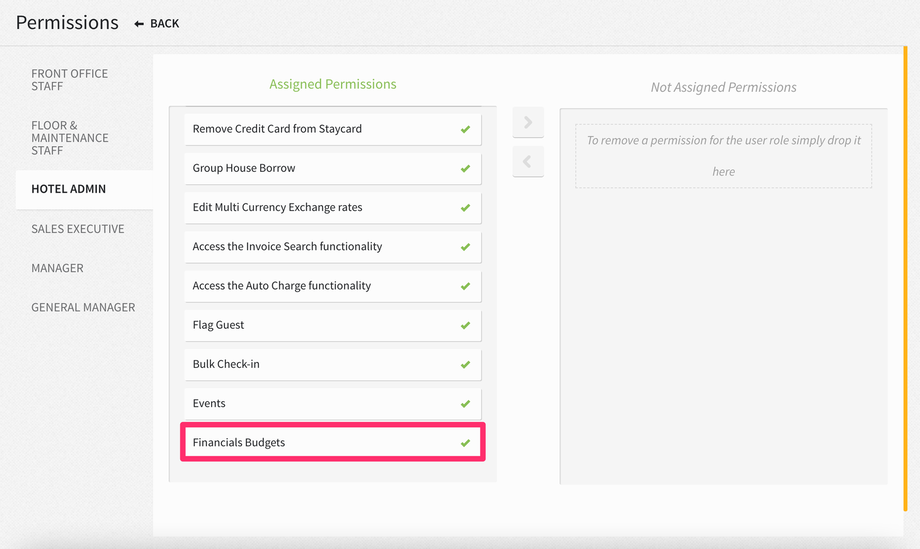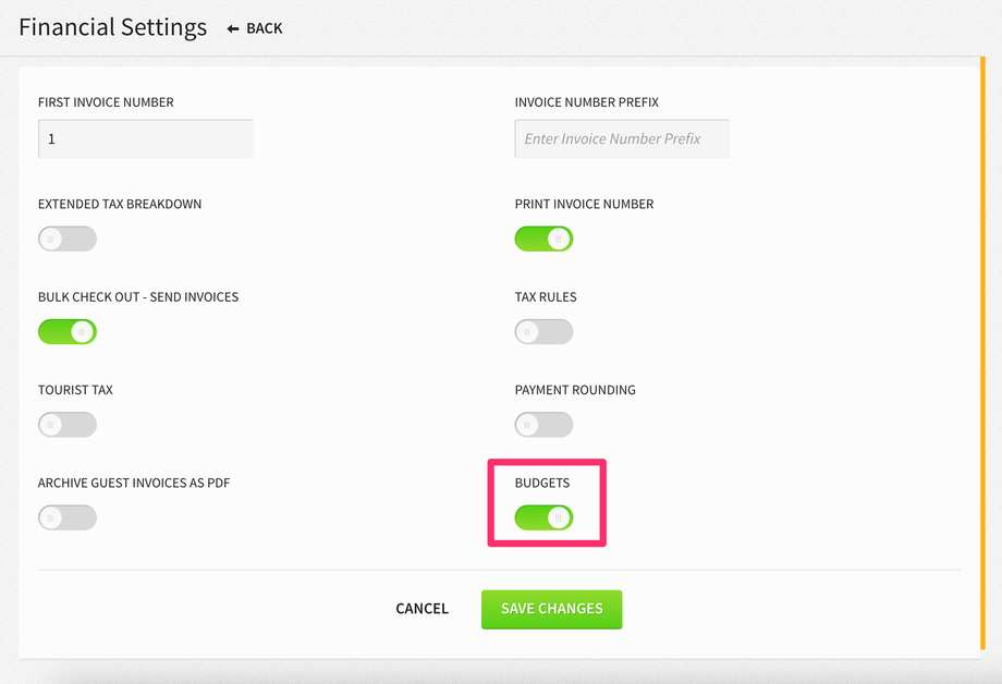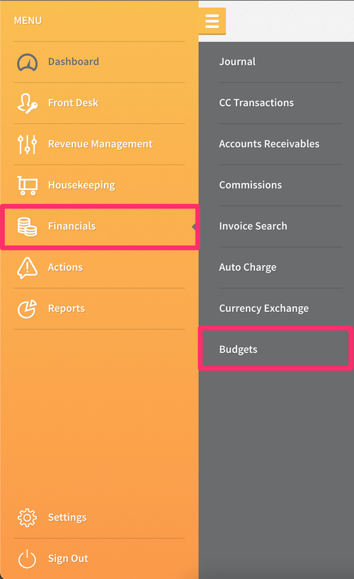 When the BUDGETS toggle is turned ON and the Financials Budgets permission is assigned from Settings > Hotel & Staff > Permissions, a new menu item will appear in Financials called Budgets.