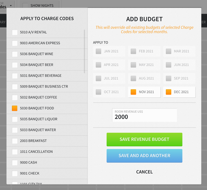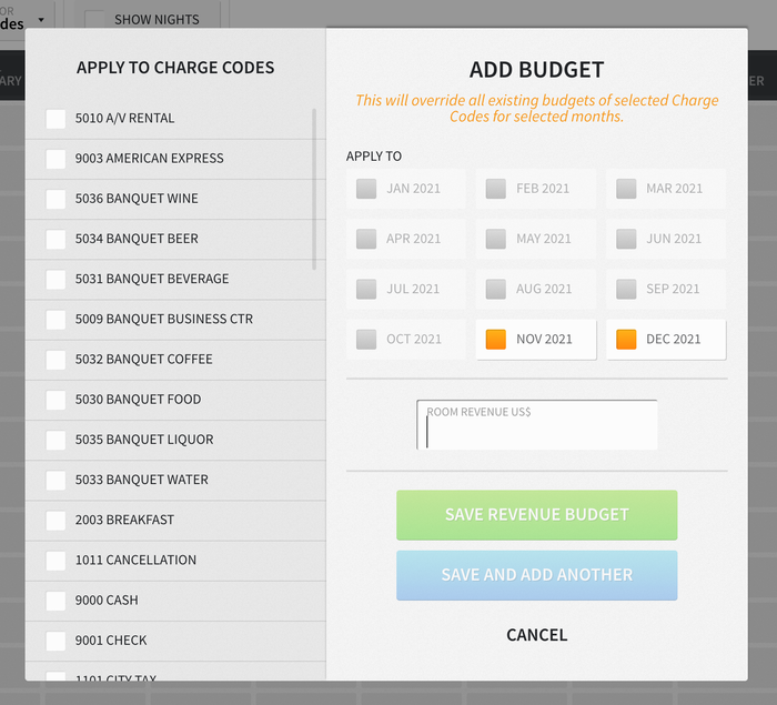 Furthermore, you can add numbers per month and charge code/market or apply a budget to multiple months and charge codes/markets by selecting the green ADD BUDGET button. If applying a budget to multiple months and charge codes/markets, you can click SAVE REVENUE BUDGET once complete, or you can click SAVE AND ADD ANOTHER to add another budget.