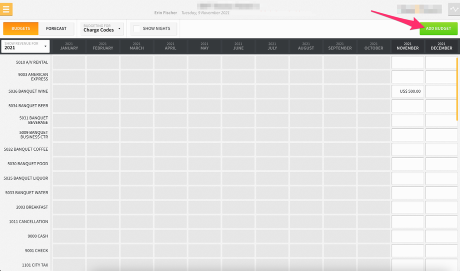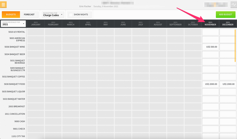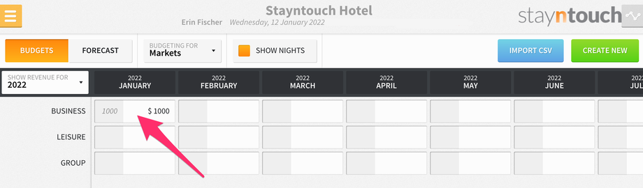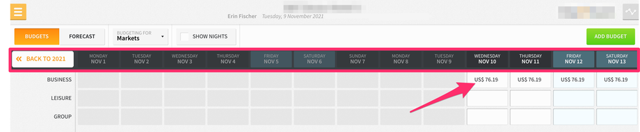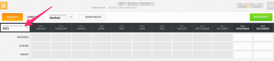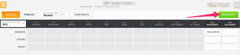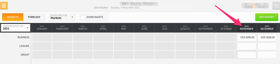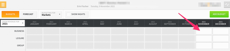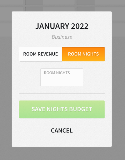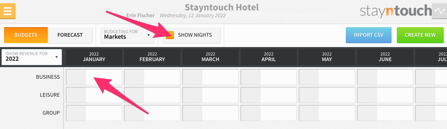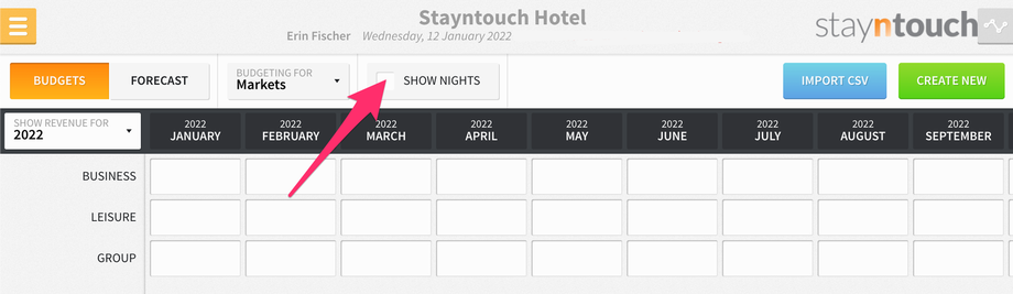 Furthermore, if you select the SHOW NIGHTS checkbox at the top of the screen, you can set budgets for projected nights for each market/charge code.