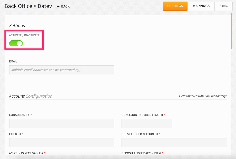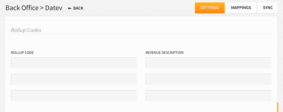 You can also export summarized revenue for charge codes by mapping them against a rollup code. You can set up roll up codes (minimum 4 characters) from Settings > Integrations > Back Office > DATEV > Rollup Codes. Please note, the ACTIVATE/INACTIVATE toggle must be turned ON for DATEV in order to add rollup codes.