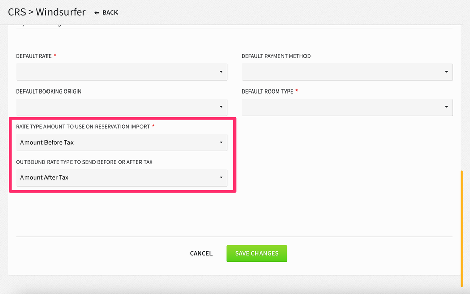 For Windsurfer, we have added the option to define if rates are sent and received including or excluding taxes. This can be configured from Settings > Integrations > Central Reservation System > Windsurfer.