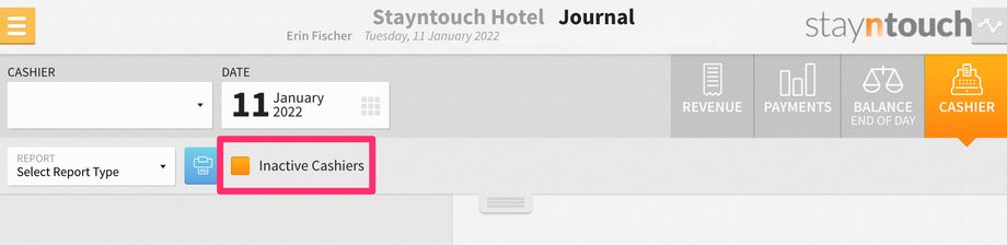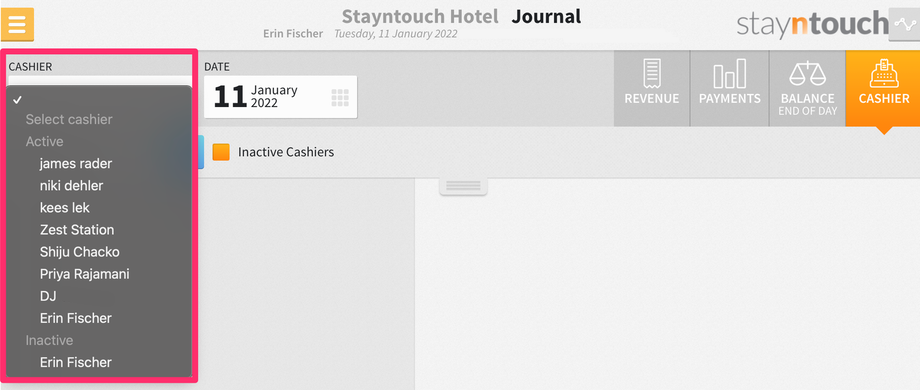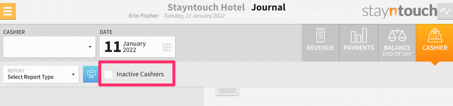You can now exclude inactive cashiers from the CASHIER dropdown menu in Front Desk > Cashier. By default, you will only see Active cashiers indicated from the dropdown menu. However, if you want to show inactive cashiers, you can click the dropdown bar in the center of the screen and click the Inactive Cashiers checkbox, which will then include Inactive cashiers.