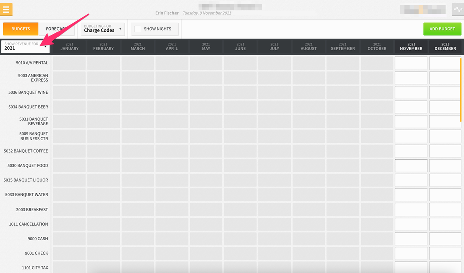 From Financials > Budgets, users will have the ability to select the year they want to add budgets for charges codes and markets. Budgets for the current year +/- 2 years will be displayed. Whereas budgets for the current year +/- 2 years will be displayed, only future dates can be updated. So, for example, if the current year is 2021, you will see budgets for 2019, 2020, 2021, 2022, and 2023. You can then enter a budget by month and charge code/market.