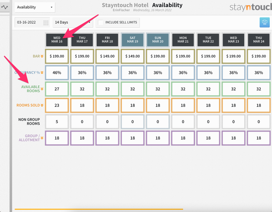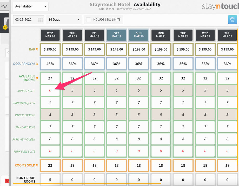 If you take a look at the Availability screen again, however, you’ll still see that on March 16, the Junior Suite room type has an availability of 0. If you click the INCLUDE SELL LIMITS checkbox, however, the availability for the Junior Suite room type on March 16 will show as 3, because you’re including sell limits.