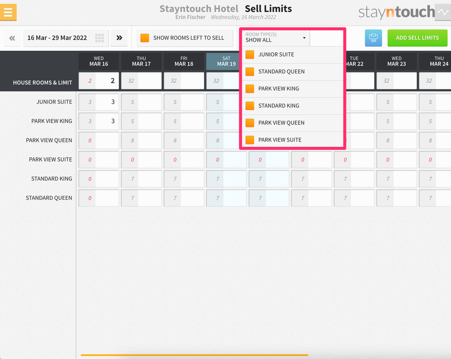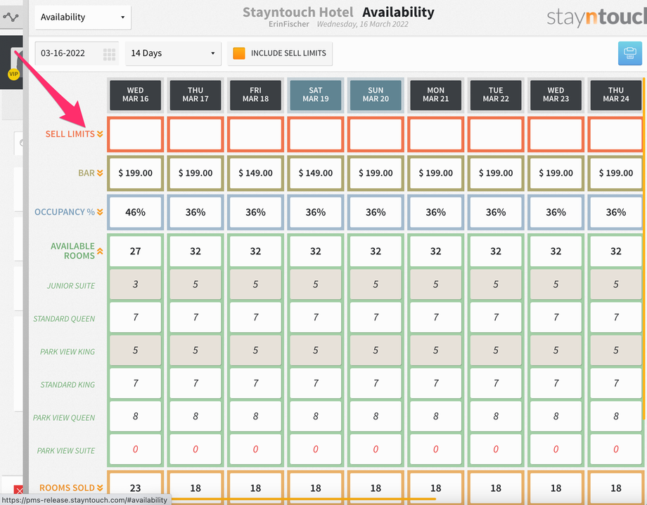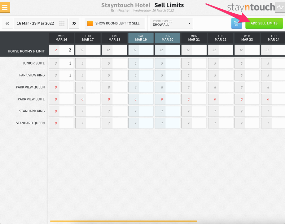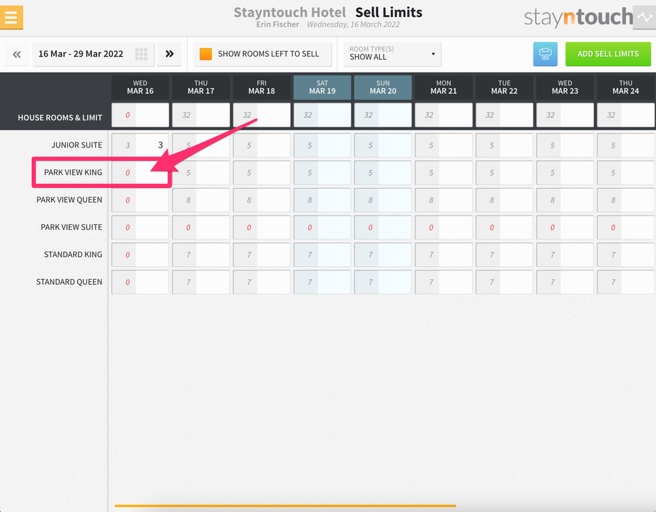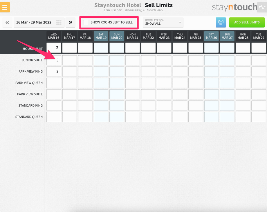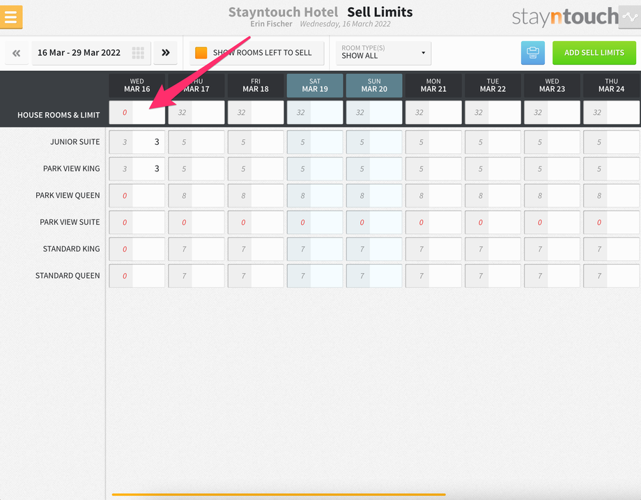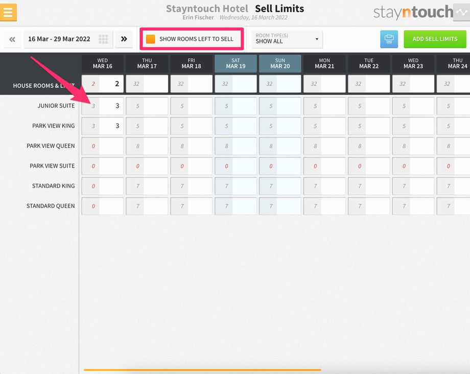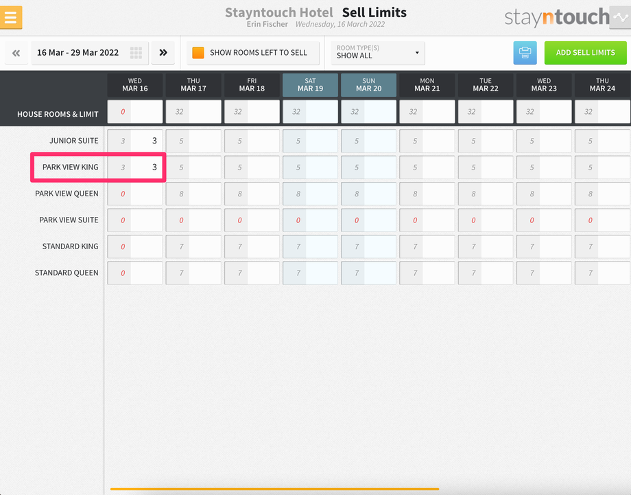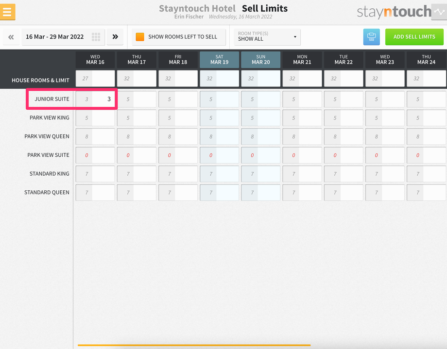 Additionally, you’ll see a new bar that shows at the top of the screen for SELL LIMITS, and if you expand that, you’ll see 3 sell limits for the Junior Suite room type on March 16.