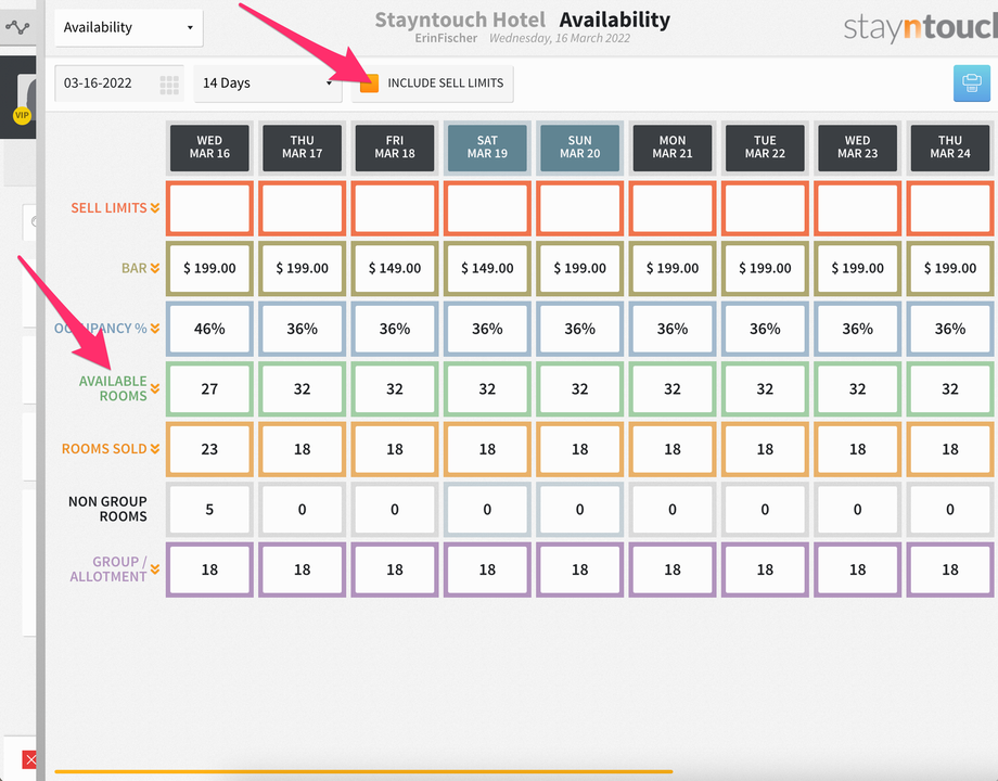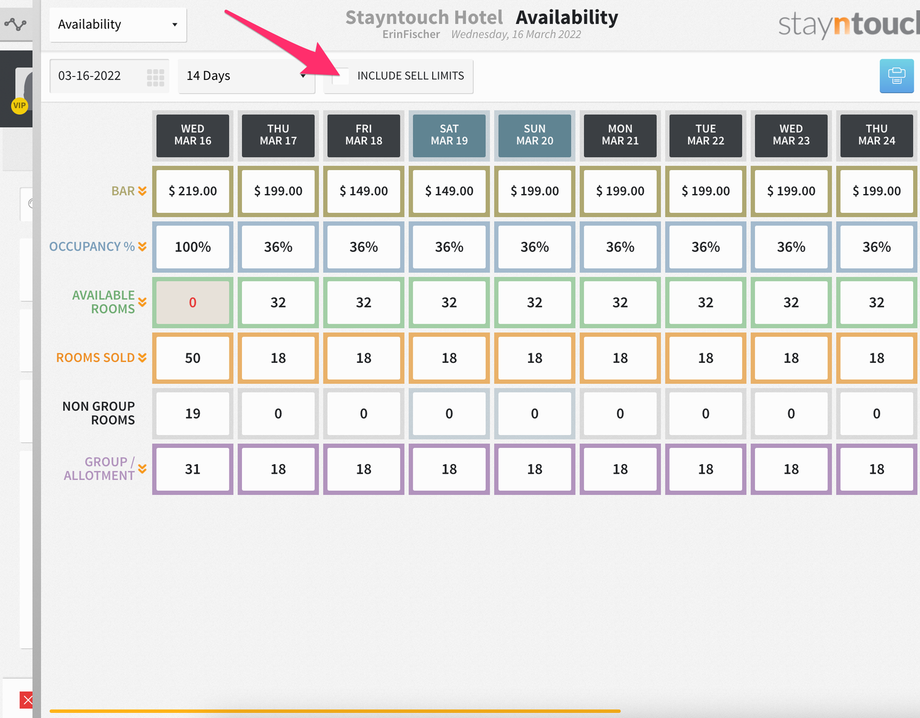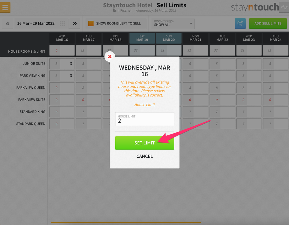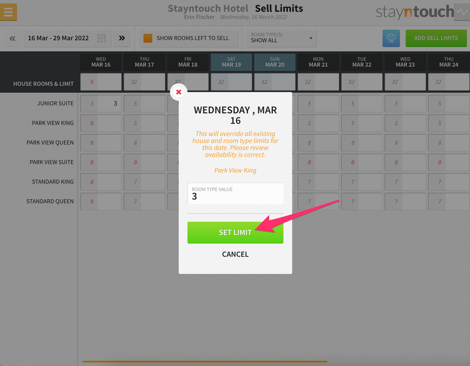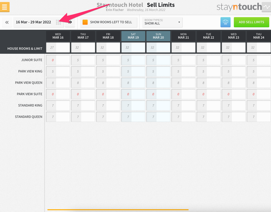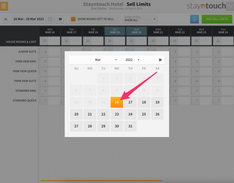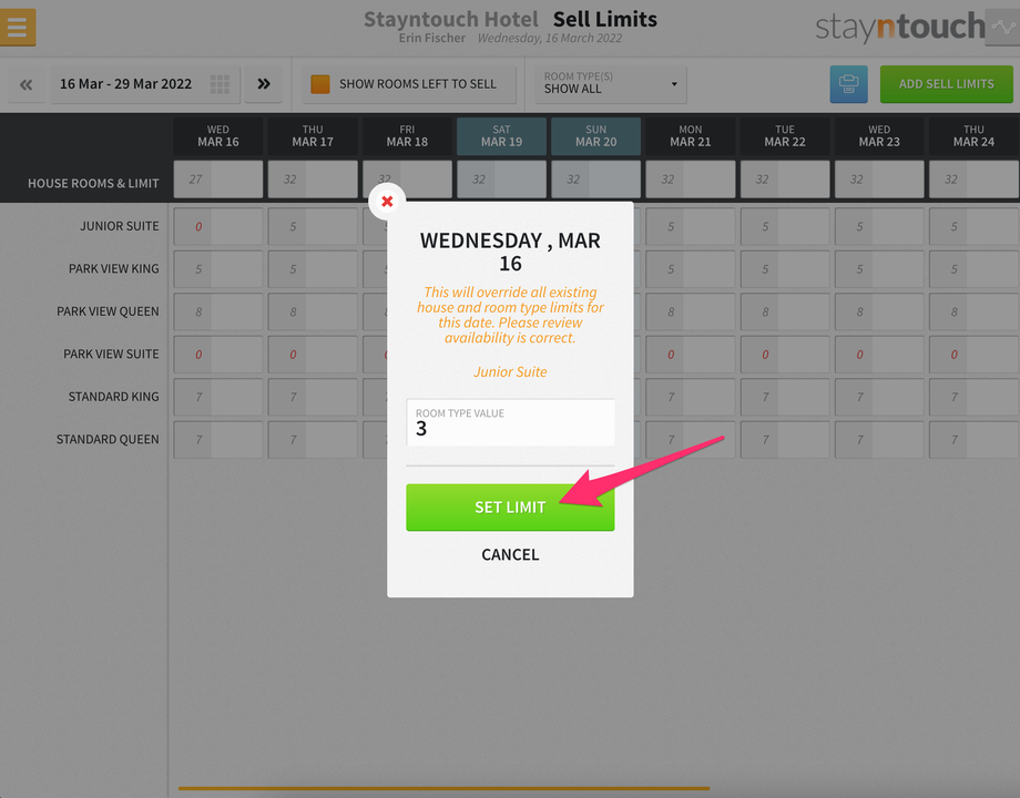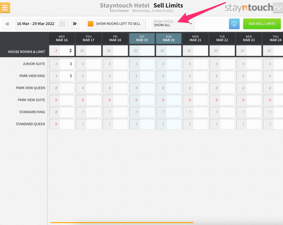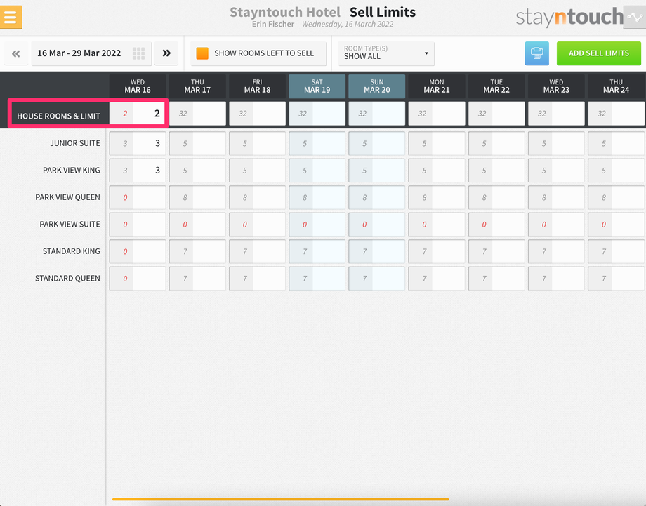 Additionally, you’ll see a new bar that shows at the top of the screen for SELL LIMITS, and if you expand that, you’ll see 3 sell limits for the Junior Suite room type on March 16.