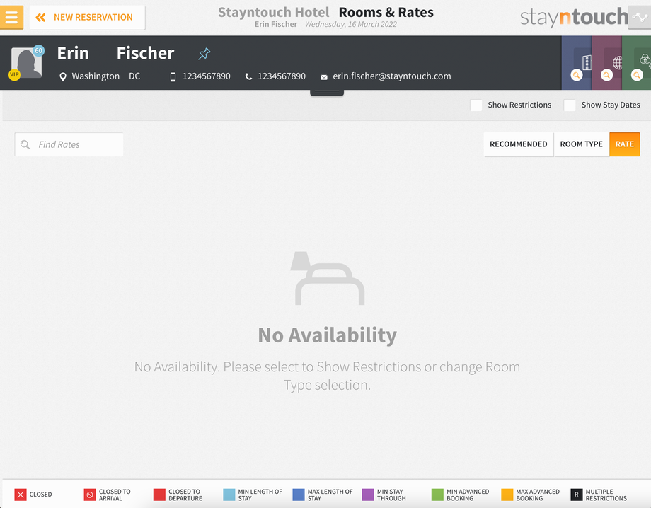 Next, we’ll discuss how to overbook by room type, or how to set sell limits for room type. If you go to create a reservation for a specific room type (in this example, Junior Suite) on March 16, you can see there’s no availability for this room type, because the hotel is sold out for that particular room type on March 16.