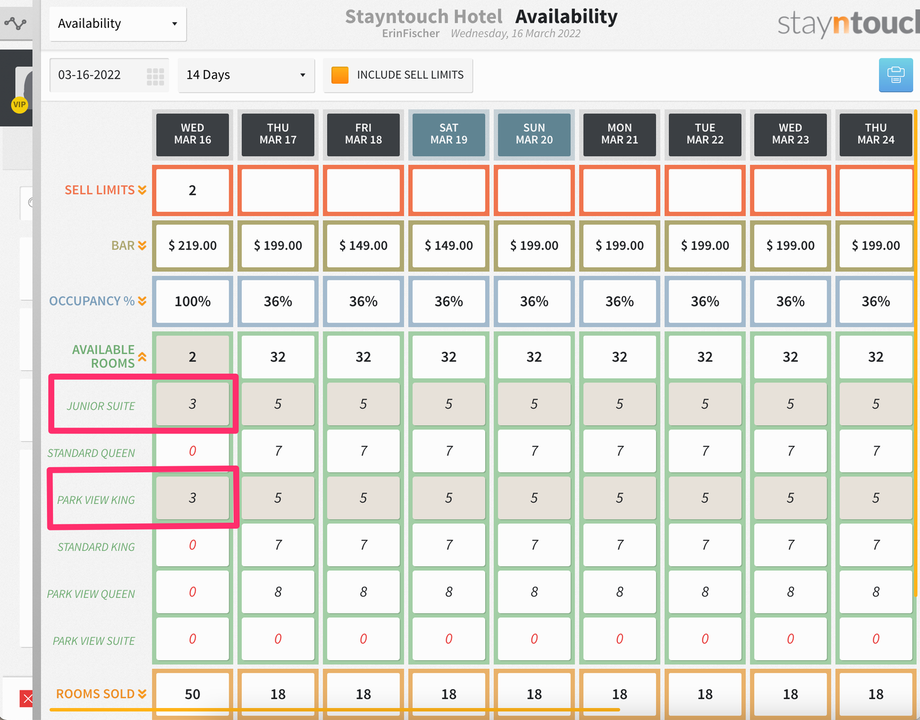 Now, if you go back to the Availability screen and choose to INCLUDE SELL LIMITS, you can see that there are 2 rooms to sell for March 16. If you look at availability, it does show 3 rooms for both Junior Suite and Park View King, but again, because the house limit is set at 2, you can only overbook by 2 rooms.