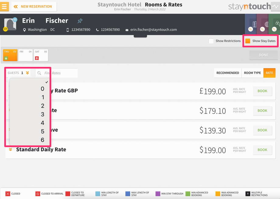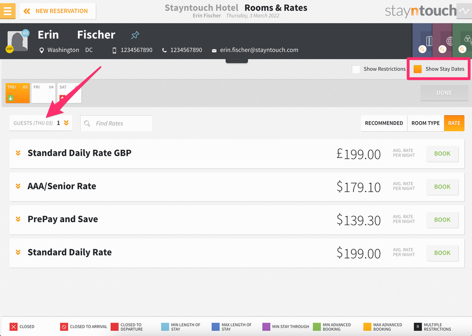 Next to this, you will also see a checkbox for Show Stay Dates, which, when selected, will show the guest’s stay dates and allow you to change the number of guests. By selecting Show Stay Dates, you can choose different rates for different dates by clicking on a date and choosing a different rate than the other date(s). Click DONE to save the rates.