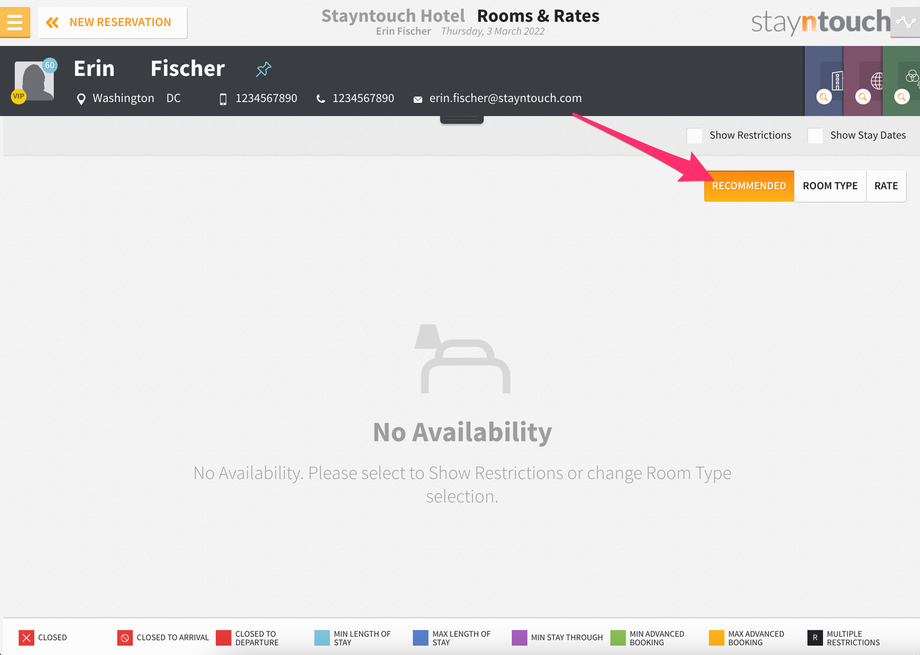 From this page, you’ll also be able to sort by RECOMMENDED, ROOM TYPE, and RATE. To determine the tab to which users are directed, navigate to Settings > Reservations > Reservation Settings and select either Recommended, By Room Type, or By Rate from the DEFAULT RATE DISPLAY dropdown menu. Users will then default to the chosen tab during reservation creation.