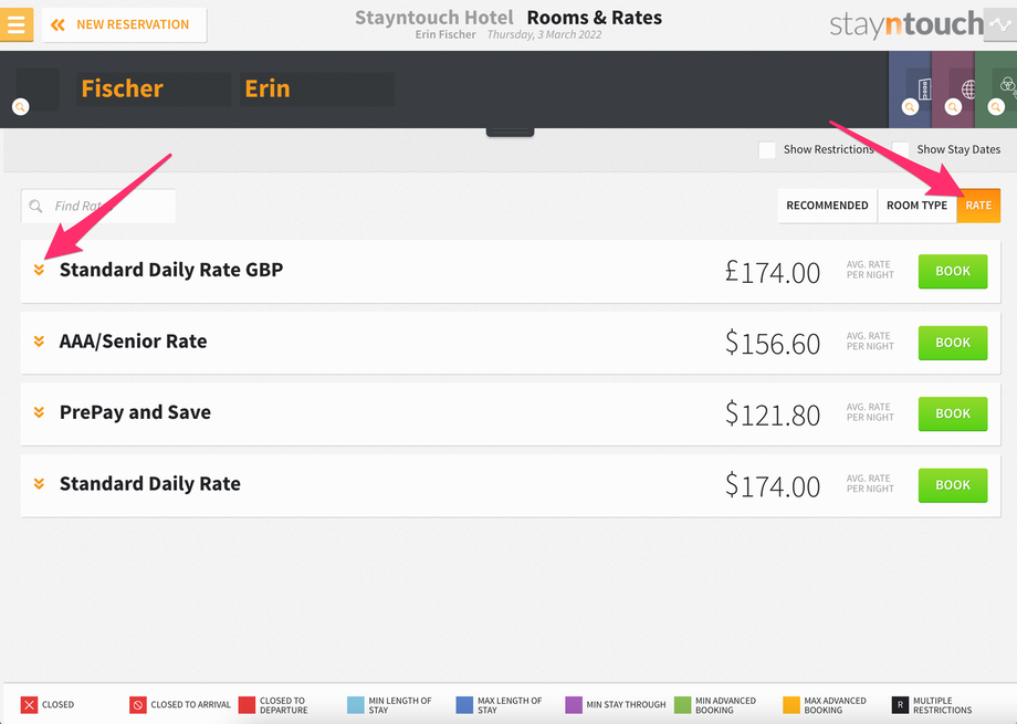 Below this, you can select a checkbox for Show Restrictions. Based on your user permissions, you may or may not be able to select a restricted rate for a guest.