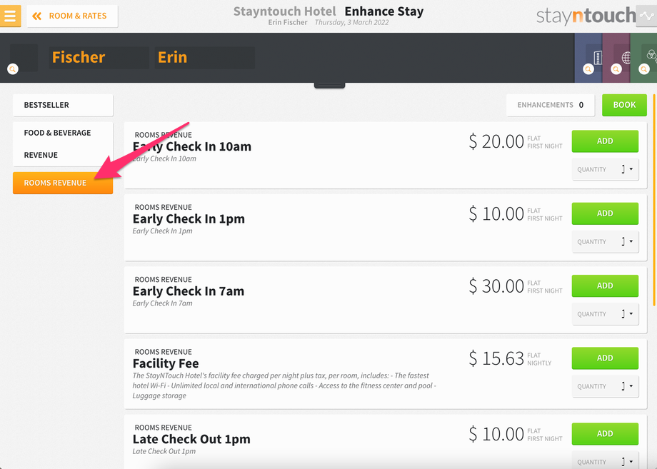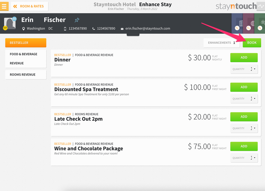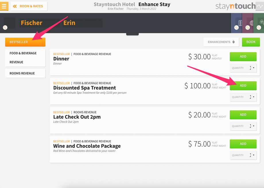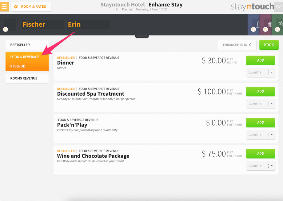 After you select the BOOK button, you will be directed to the Enhance Stay screen, where you can attach add-ons to the reservation. Here you will see a selection of different packages your property offers by charge group, and an add-on can be attached simply by clicking the green ADD button.