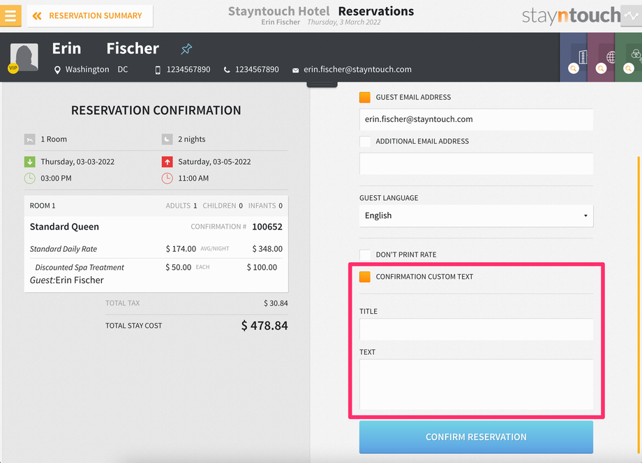 Once you’ve selected a PAYMENT TYPE, you will be able to proceed by selecting the green CONTINUE button. On this last screen, you can review the reservation and specify if the confirmation email should be sent to one or multiple email addresses. As you can see, you can also choose not to print the guest rate by selecting the checkbox DON’T PRINT RATE, and if you’d like to enter a unique, personalized message that will appear in the guest confirmation email, you can do so by selecting CONFIRMATION CUSTOM TEXT. After reviewing this information, simply click CONFIRM RESERVATION to finalize your reservation. The reservation is confirmed, and you can proceed to the guest stay card or navigate back to the dashboard if desired.
