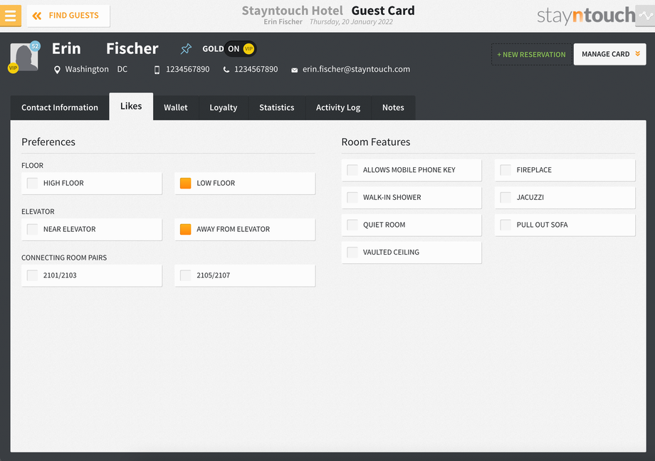 If you select an existing guest, you can view tabs for Contact Information, Likes, Wallet, Loyalty, Statistics, Activity Log, and Notes.