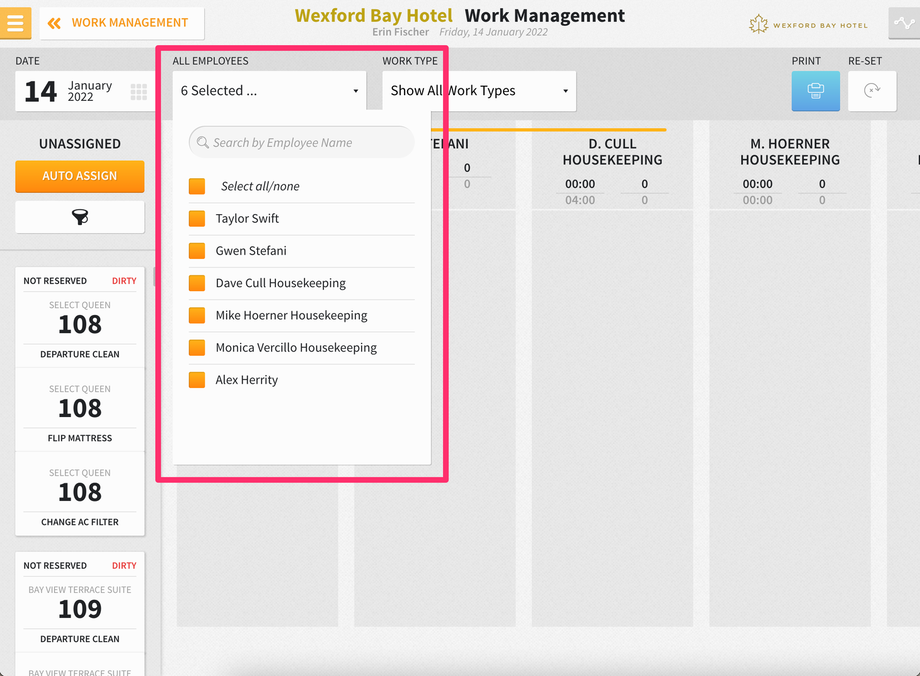 If you select the ALL EMPLOYEES dropdown menu, you can deselect the employees not working on that date and for whom a task sheet should not be completed. Please note, employee working shifts can be set up from Settings > Rooms > Task Management > Employee Working Shifts. Here, we’ve deselected Dave Cull Housekeeping and Mike Hoerner Housekeeping, and we’re left with four employees.