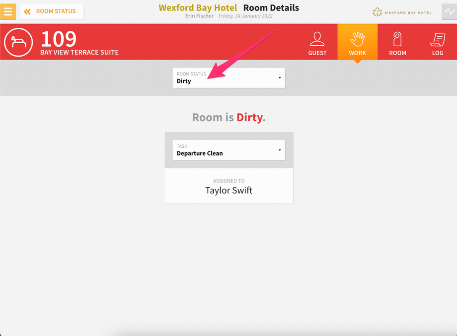 To update a record, simply click into that record, and you’ll have the option to change the status of the room by selecting the ROOM STATUS dropdown menu and updating the room status.