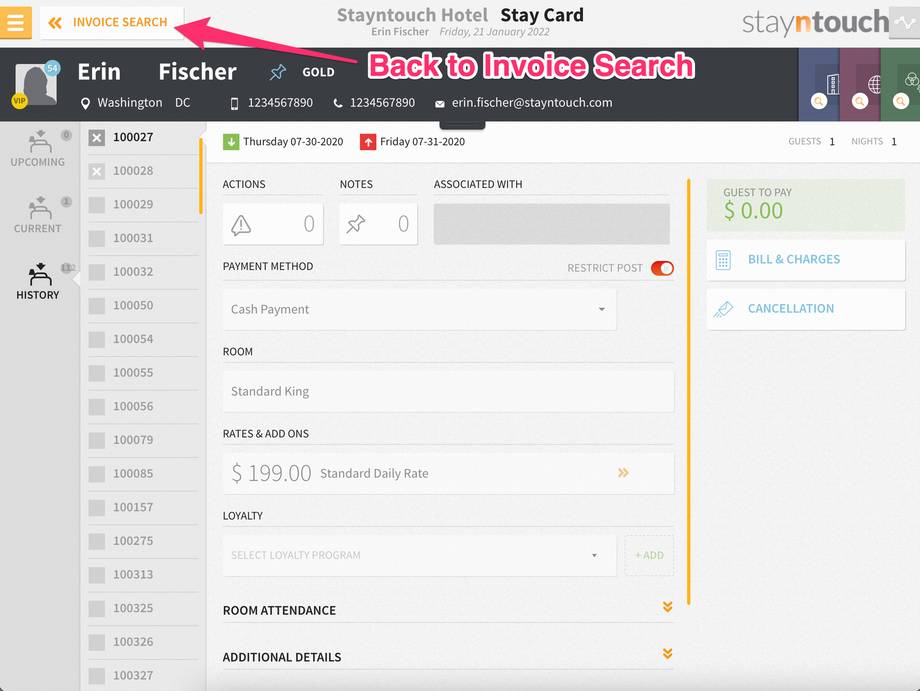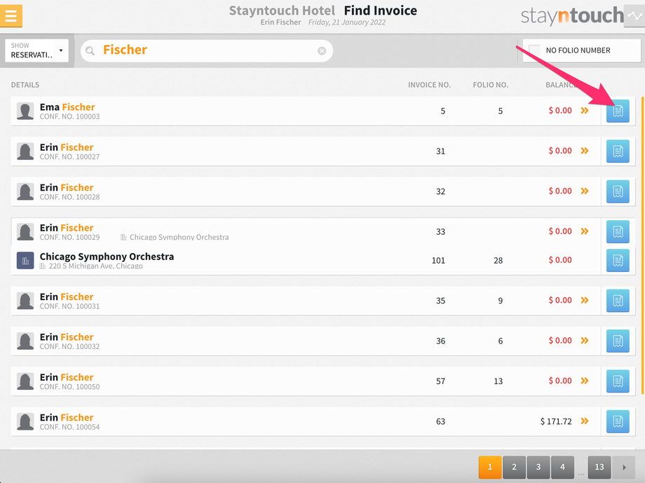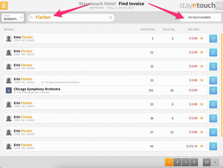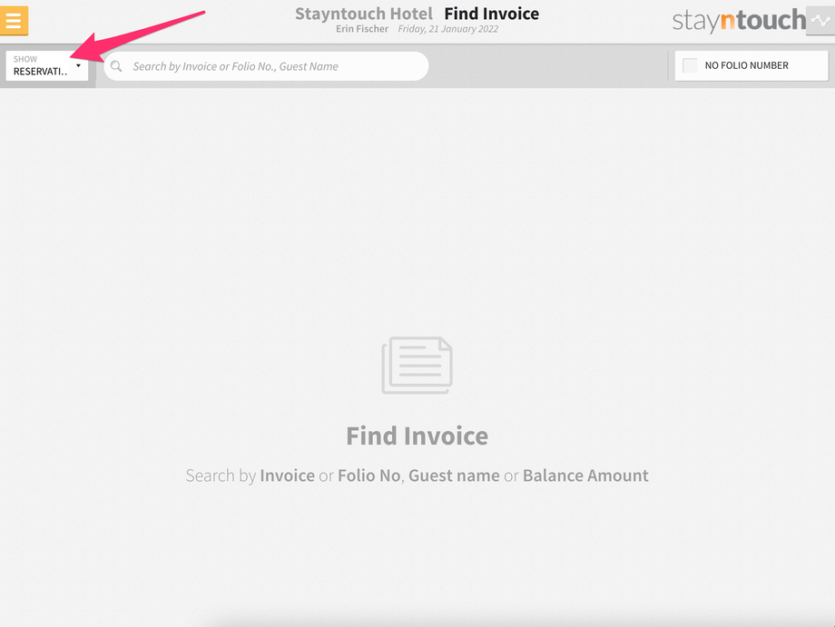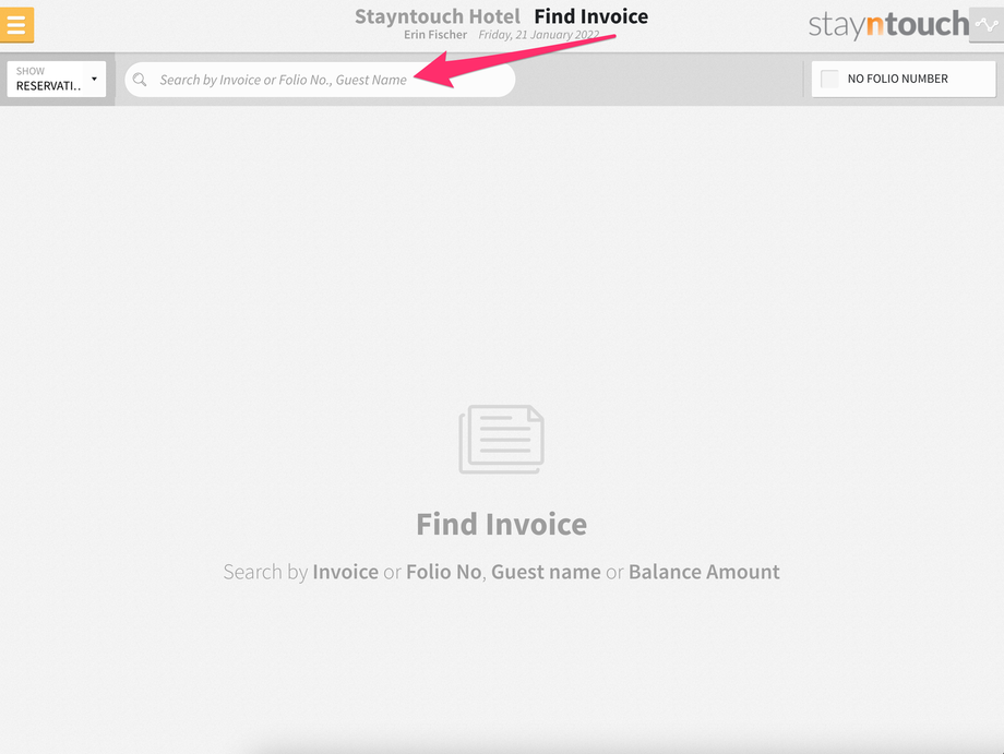 If you sort by RESERVATION INVOICES, you can search for invoices by invoice or folio number or guest name. If you select the NO FOLIO NUMBER checkbox, the PMS will show reservation invoices with no folio number. Upon entering criteria into the search field, reservation invoice details will be shown by DETAILS, INVOICE NO., FOLIO NO., and BALANCE. You can click the double arrows (>>) for reservation details or the blue invoice button to email or print the invoice.