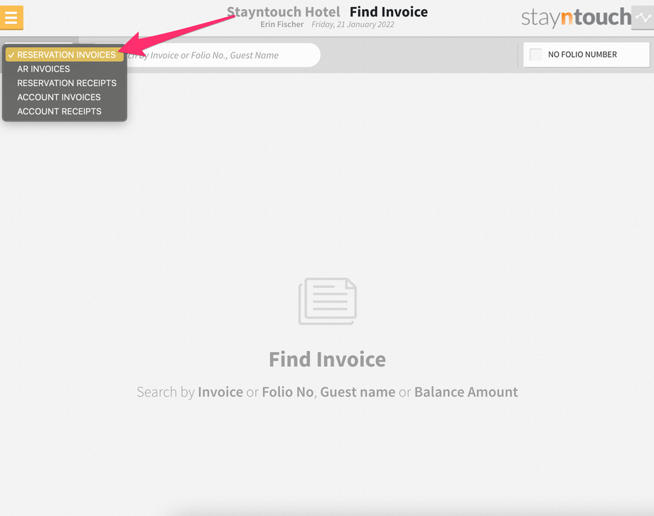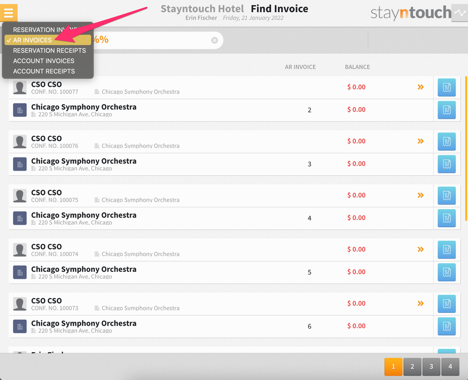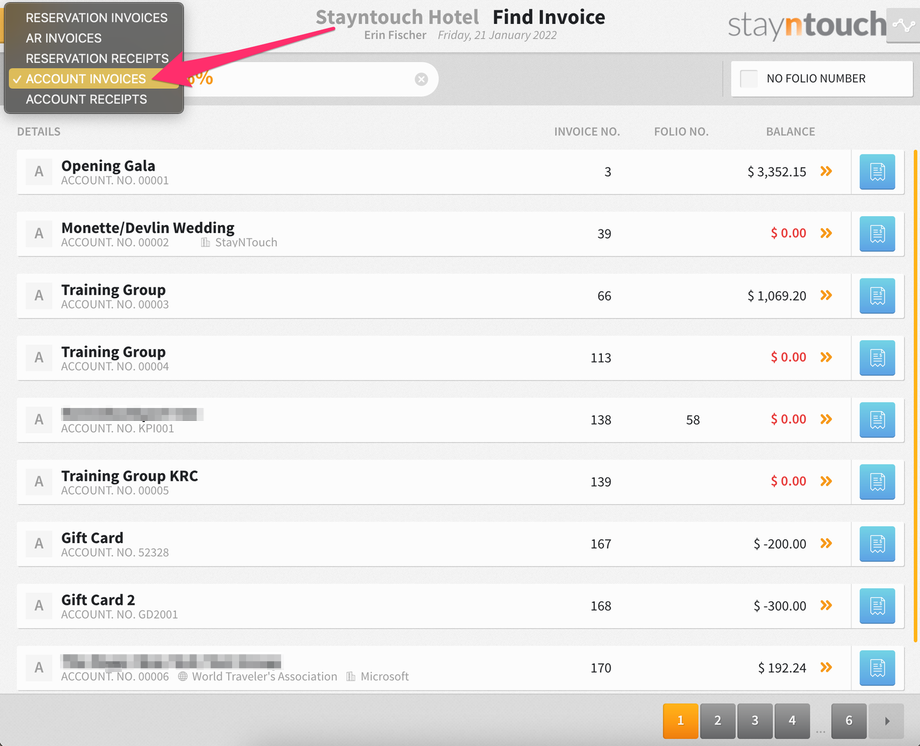 From Financials > Invoice Search, you can choose to show only RESERVATION INVOICES, A/R INVOICES, RESERVATION RECEIPTS, ACCOUNT INVOICES, or ACCOUNT RECEIPTS.