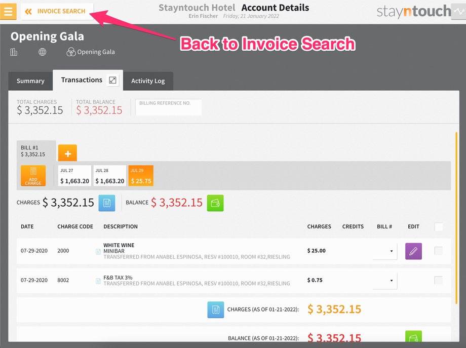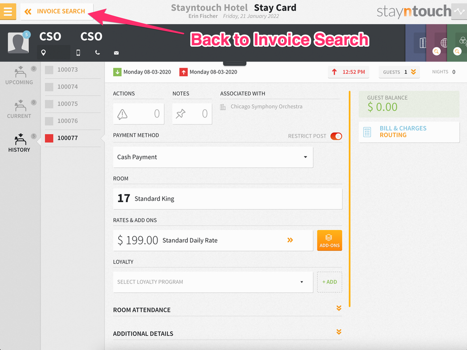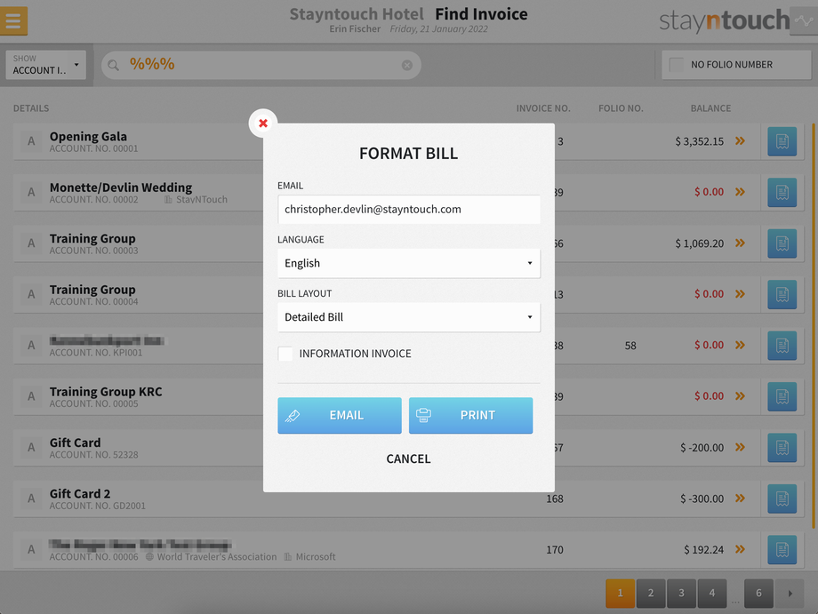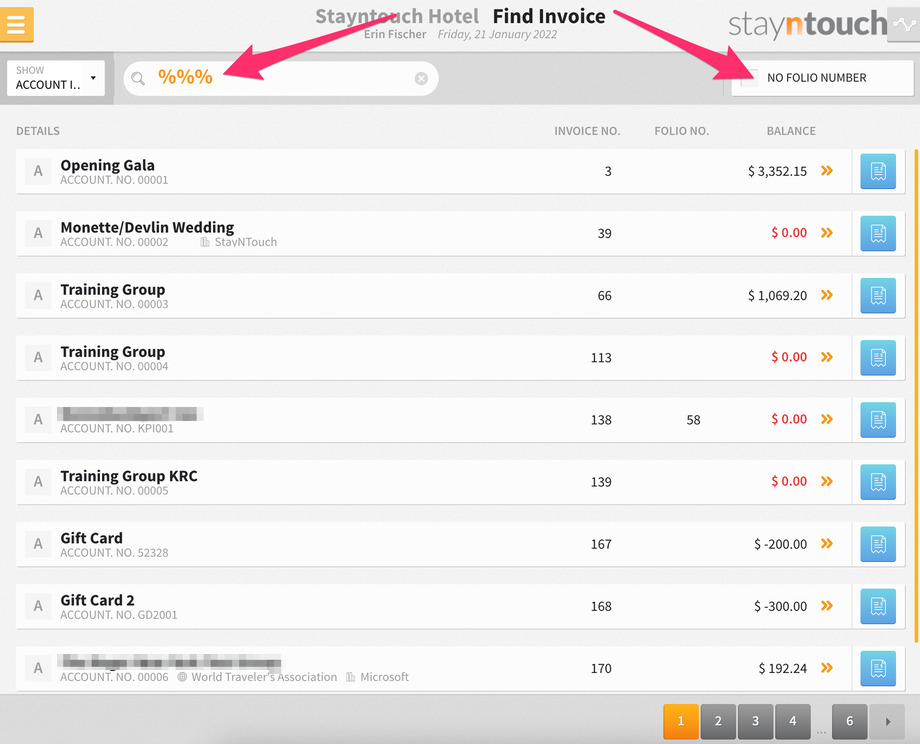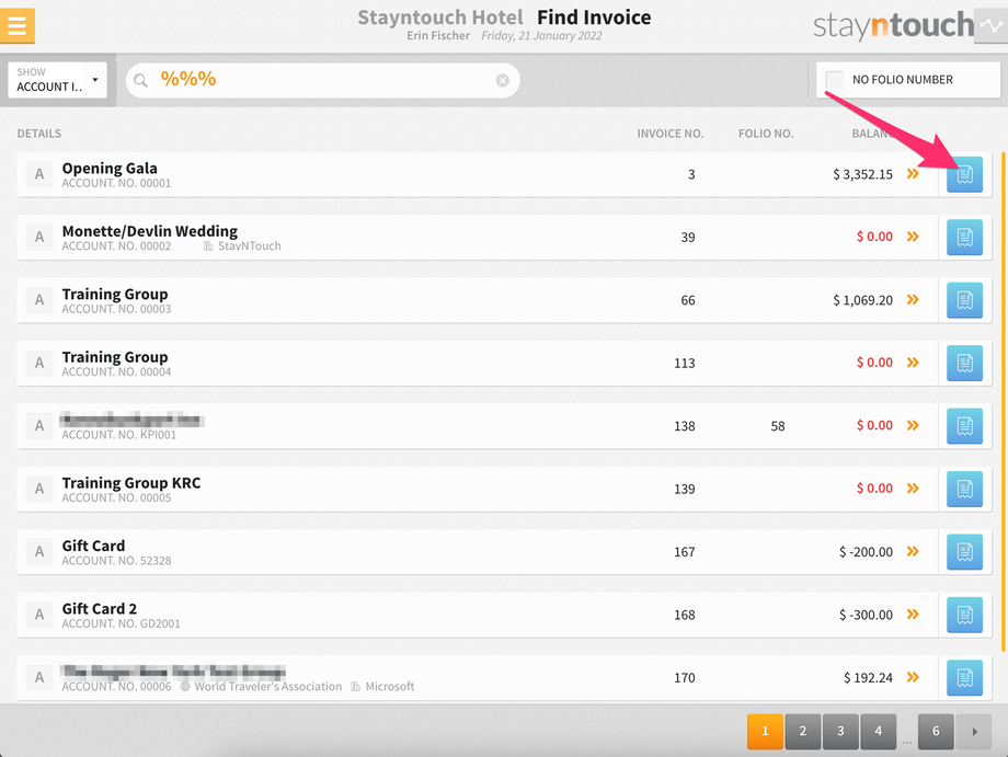 If you sort by ACCOUNT INVOICES, you can search by invoice or folio number or account name. If you select the NO FOLIO NUMBER checkbox, the PMS will show account invoices with no folio number. Upon entering criteria into the search field, account invoice details will be shown by DETAILS, INVOICE NO., FOLIO NO., and BALANCE. You can click the double arrows (>>) for account details or the blue invoice button to email or print the invoice.