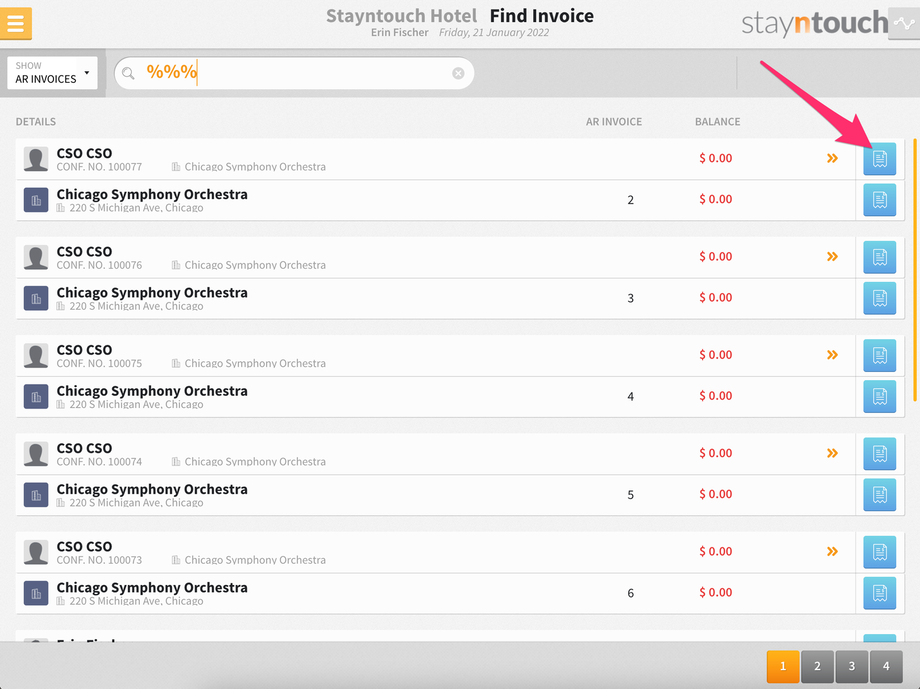 If you sort by A/R INVOICES, you can search by A/R invoice number. Upon entering criteria into the search field, A/R invoice details will be shown by DETAILS, A/R INVOICE, and BALANCE. You can click the double arrows (>>) for reservation details or the blue invoice button to email or print the invoice.