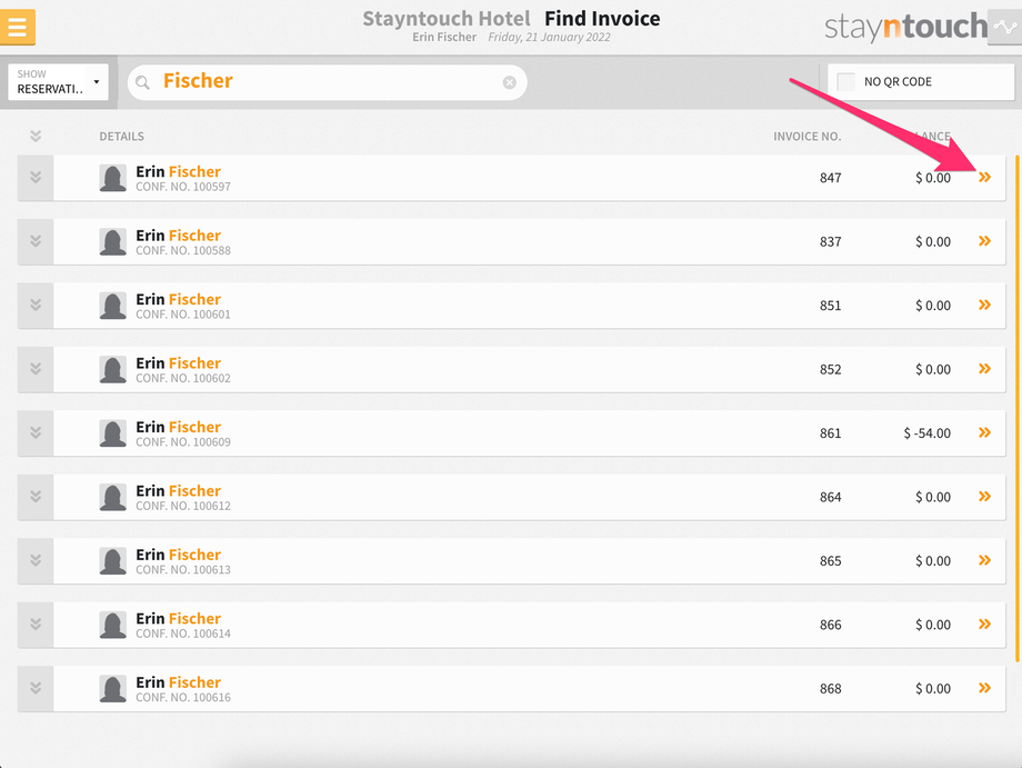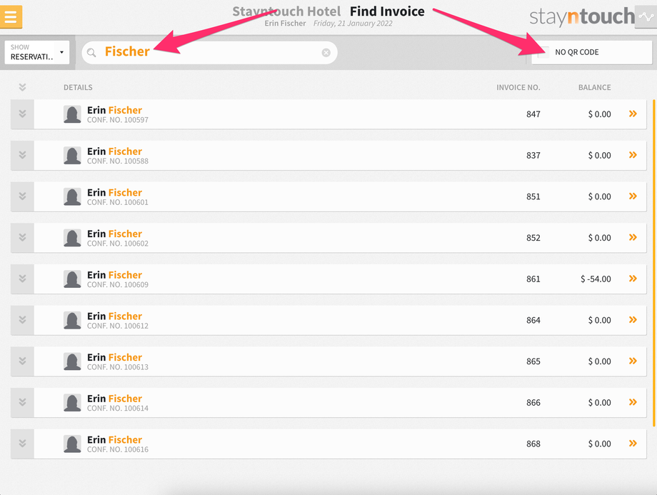 If you sort by RESERVATION RECEIPTS, you can search by receipt number or guest name. If you select the NO QR CODE checkbox, the PMS will show reservation receipts with no QR code. Upon entering criteria into the search field, reservation receipt details will be shown by DETAILS, INVOICE NO., and BALANCE. You can click the double arrows (>>) for reservation details.