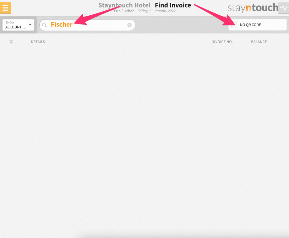 If you sort by ACCOUNT RECEIPTS, you can search by receipt number or account name. If you select the NO QR CODE checkbox, the PMS will show account receipts with no QR code. Upon entering criteria into the search field, account receipt details will be shown by DETAILS, INVOICE NO., and BALANCE. You can click the double arrows (>>) for account details.
