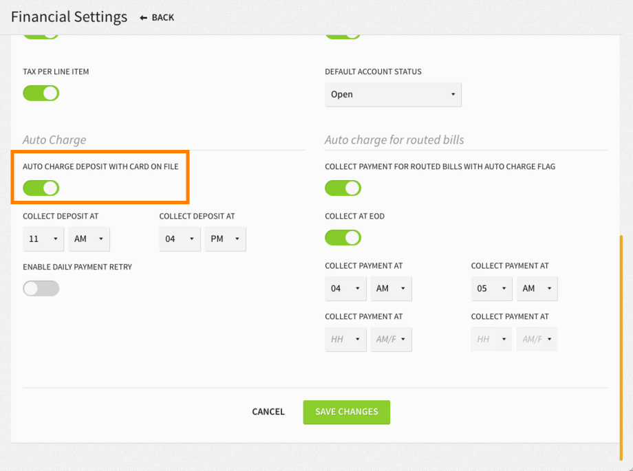For every night audit, if the AUTO CHARGE DEPOSIT WITH CARD ON FILE setting is turned ON for the hotel from Settings > Financials > Financial Settings > Auto Charge, the EOD routine will collect the configured deposit amount for reservations with a deposit rule due on that day.