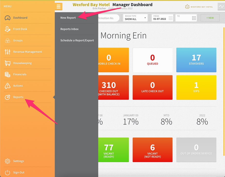 - Click on the dropdown menu at the top left corner of the Manager Dashboard and click Reports >New Report.