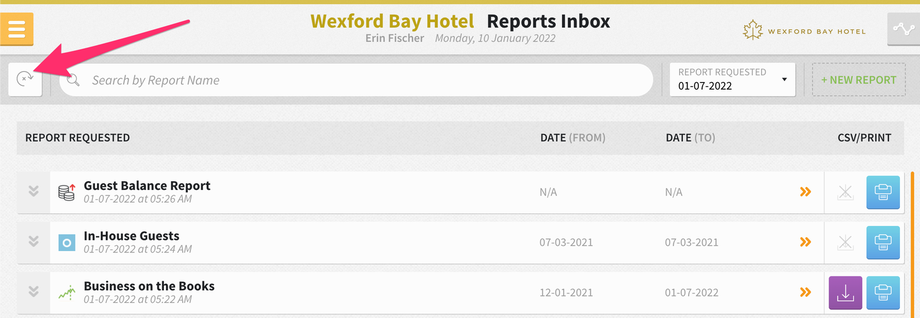- The Reports Inbox does not automatically refresh and populate generated reports when requested. In order to view newly generated reports, click the refresh button in the top left corner of the inbox.