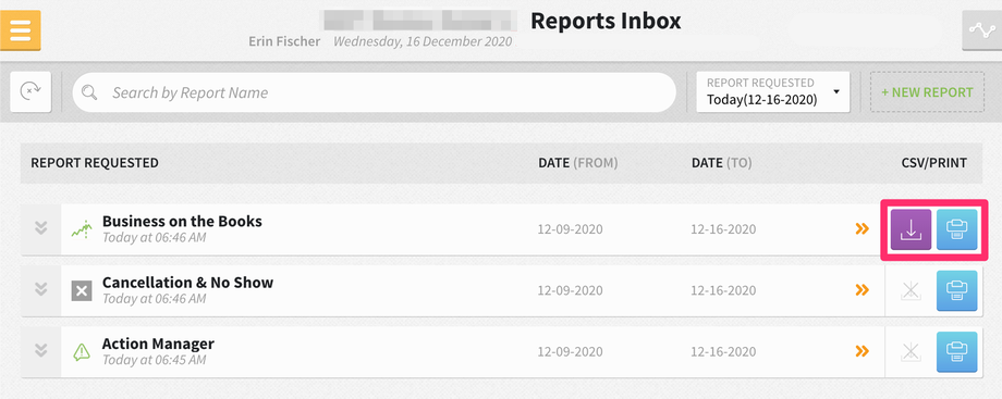 - You can also generate a new report while in the Reports Inbox by clicking the + NEW REPORT button next to the REPORT REQUESTED box.
