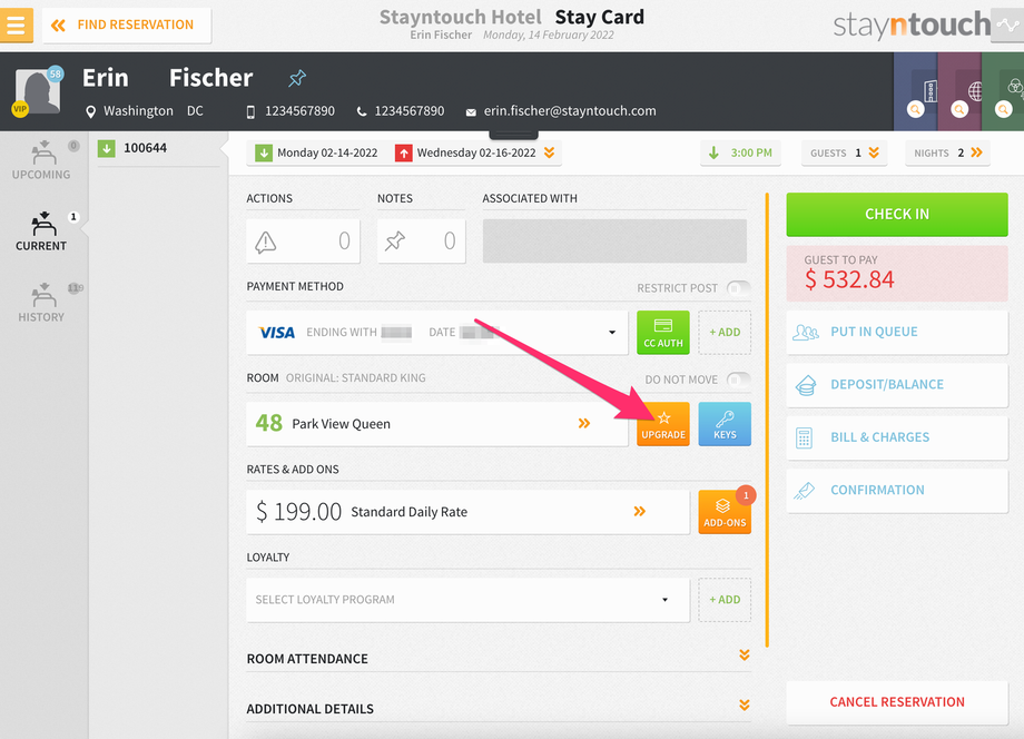 ROOM information and the option to upgrade a guest’s room type are available as indicated below.