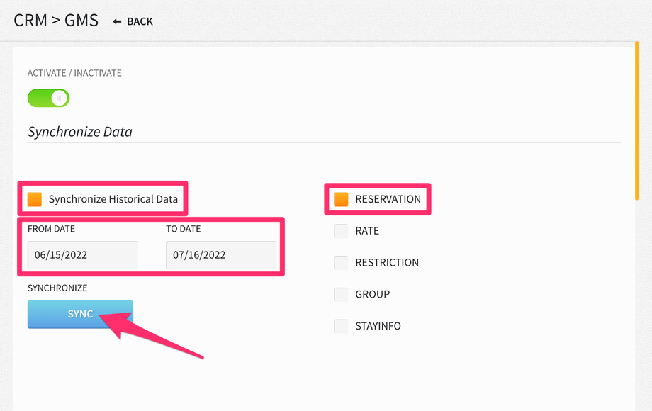 You'll then need to sync historical reservation messages, so select the RESERVATION checkbox and choose a FROM DATE (this should be the date Stayntouch PMS was installed) and a TO DATE (this should be the current date).