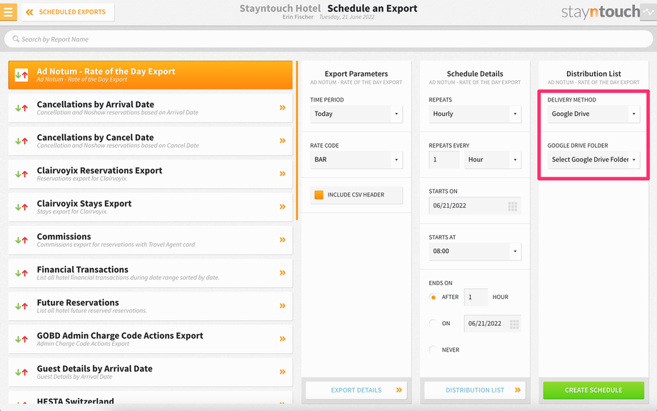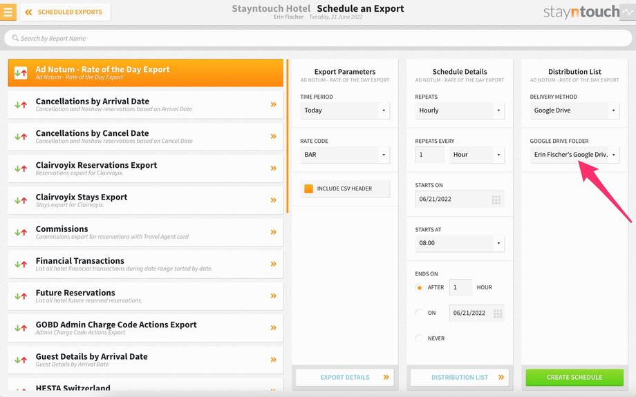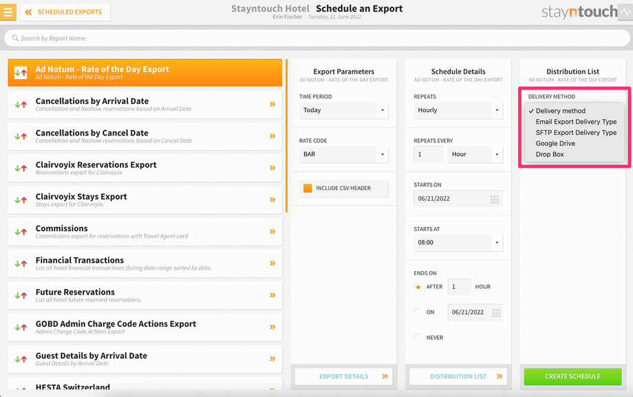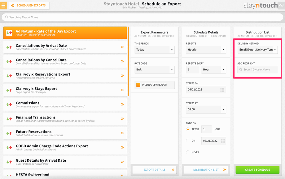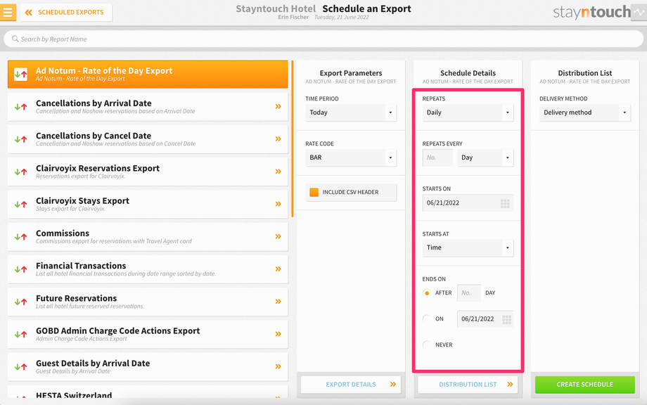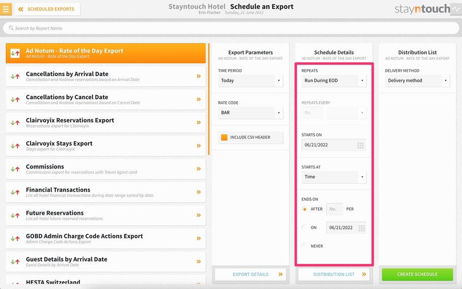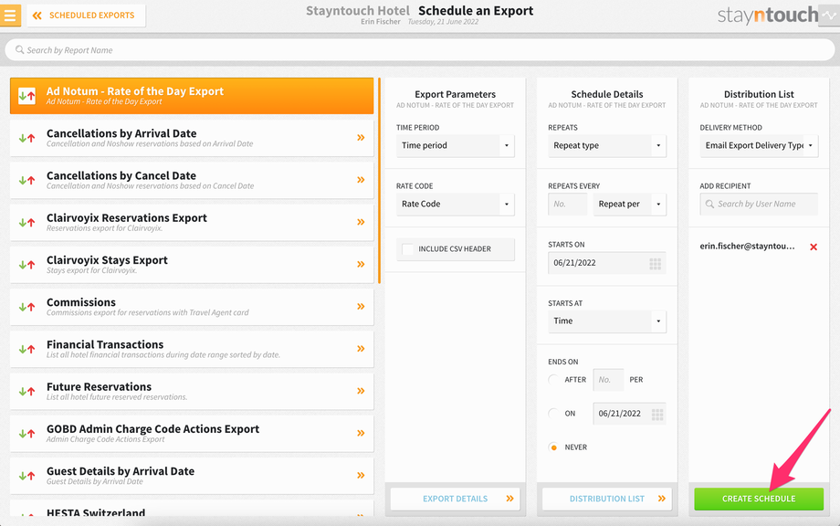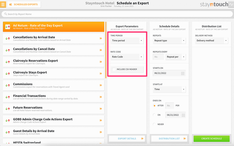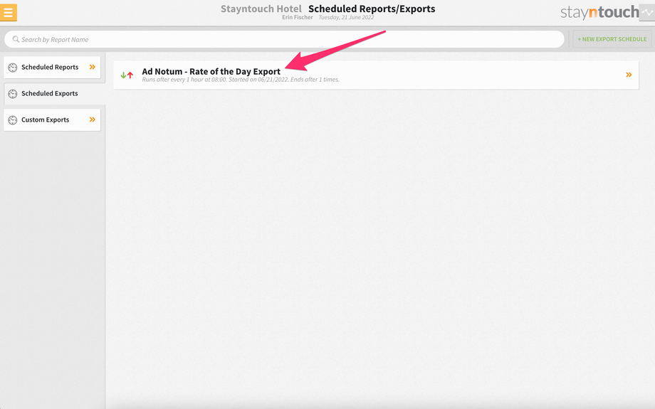 To set up a scheduled export for Ad Notum – Rate of the Day Export, navigate to Reports > Schedule a Report/Export > Scheduled Exports > + NEW EXPORT SCHEDULE > Ad Notum – Rate of the Day Export. This will generate an export showing the amount of the selected rate code by single and double occupancy as well as by room type for the current date.