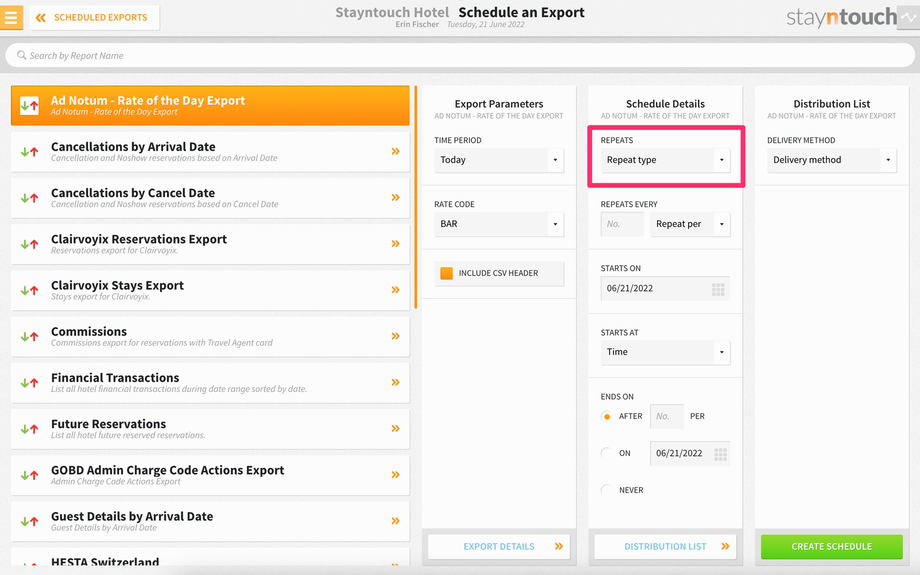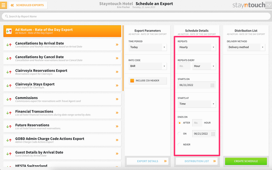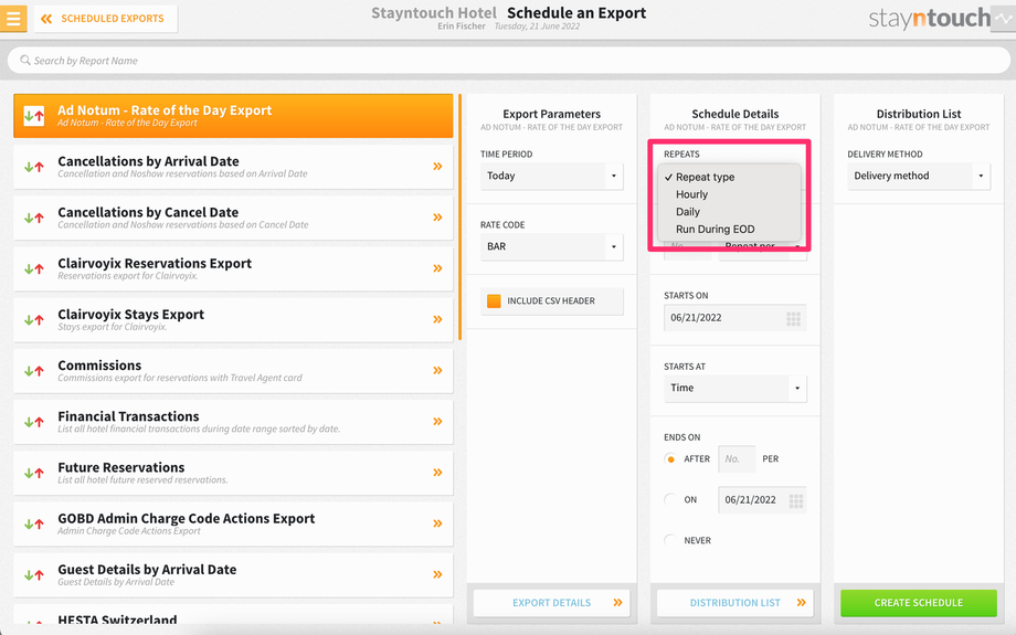 You can now move onto Schedule Details, where you can indicate how often the export REPEATS. Select from Hourly, Daily, or Run During EOD.