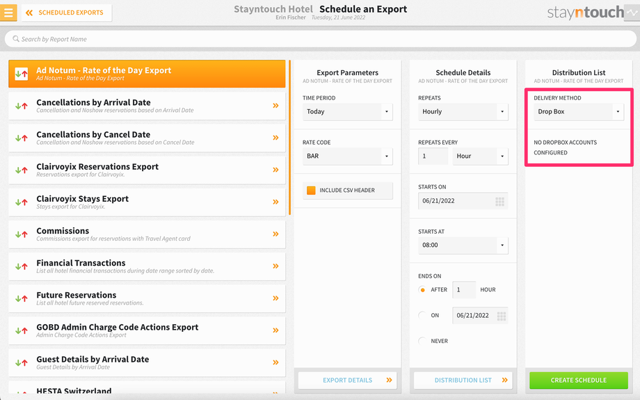 If you select Dropbox, choose from a pre-configured Dropbox account. You can learn how to configure a Dropbox account here. Please note, as of the v5.54 release, we have implemented changes to the existing workflow of Dropbox account settings. If you have any existing scheduled exports with a delivery method of Dropbox, and you fail to receive exports, please remove the old Dropbox account from Settings > Hotel & Staff > Dropbox and create a new Dropbox account.