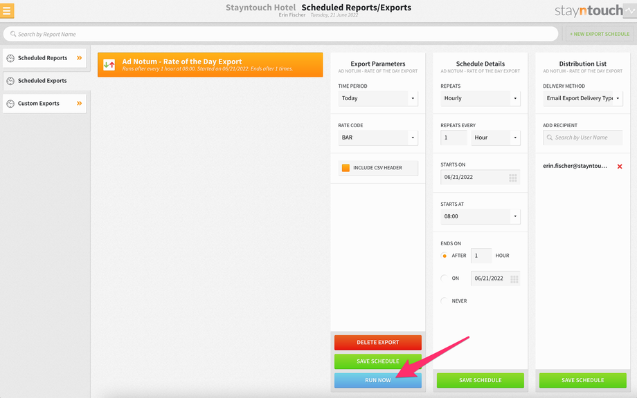 The scheduled export will appear in your list of scheduled exports from Reports > Schedule a Report/Export > Scheduled Exports. You can also click on the scheduled export and then select RUN NOW to have the report delivered to your delivery method now.