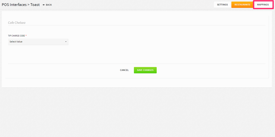 - If tips are restaurant specific where there are multiple restaurants, tips will post to charge codes configured from Settings > Integration > POS Integrations > Toast > RESTAURANTS.
