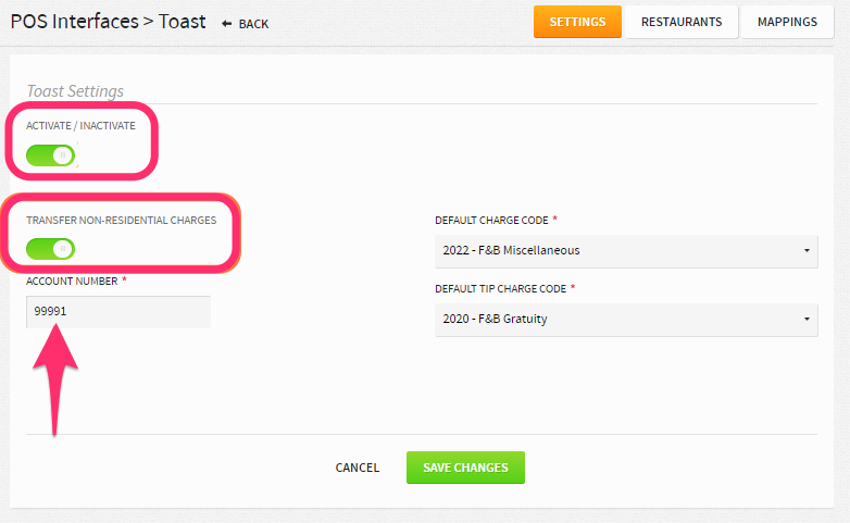 4. Add the house account to the POS configuration. Navigate to Settings > Integrations > POS Integration > Toast. Now turn ON the TRANSFER NON-RESIDENTIAL CHARGES toggle.