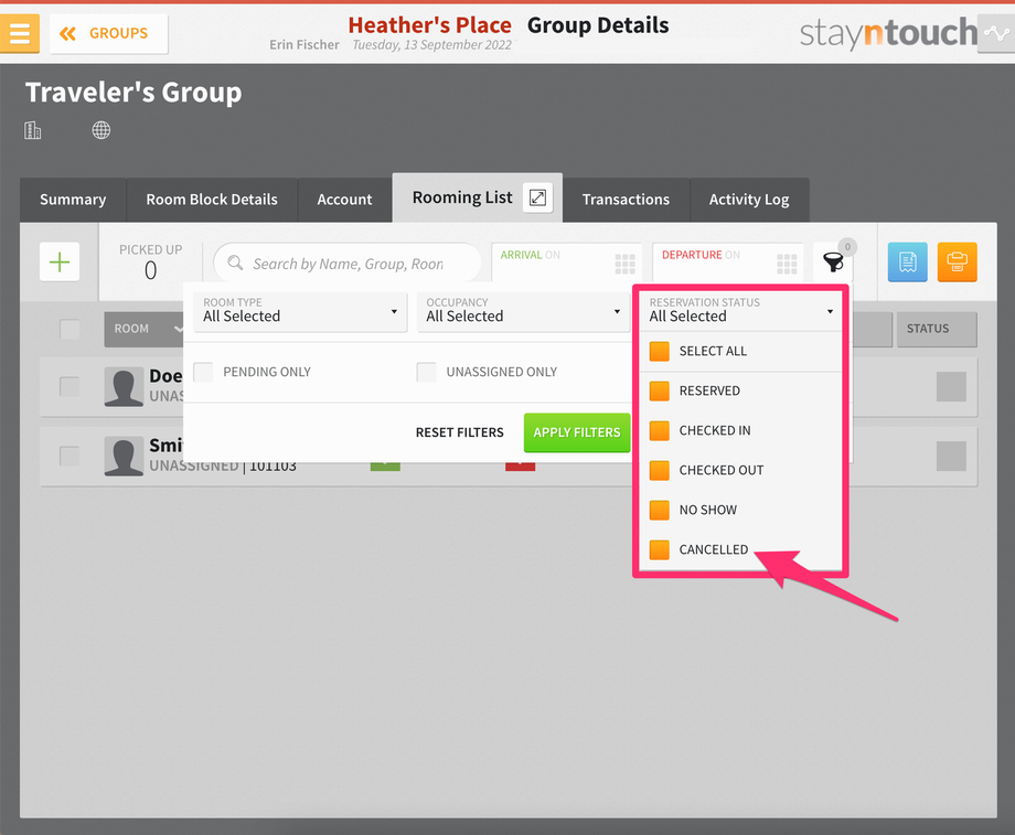 Please note, you’ll notice that the EXCLUDE CANCELLED option has been removed as a filter, as CANCELLED is now an option within the RESERVATION STATUS filter.