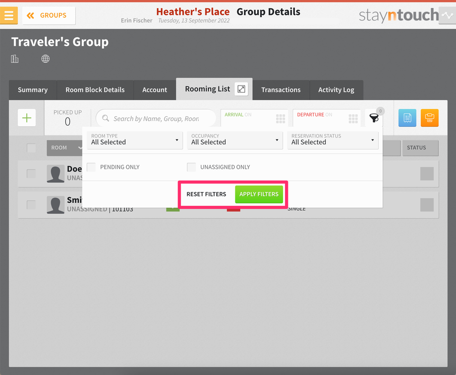 You’ll also be able to see how many filters are applied. The number of filters applied is updated once the user chooses to apply the filters. These filters will apply to the print and CSV export versions of the Rooming List.