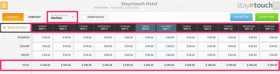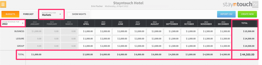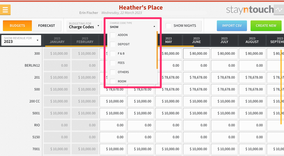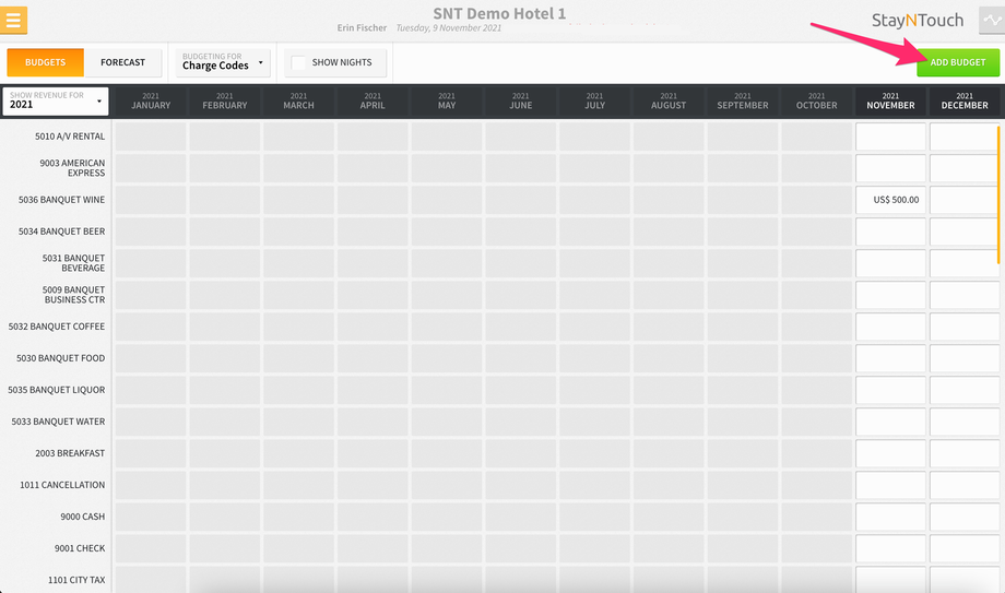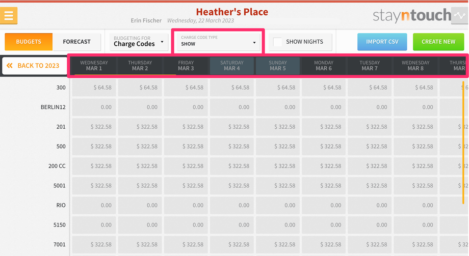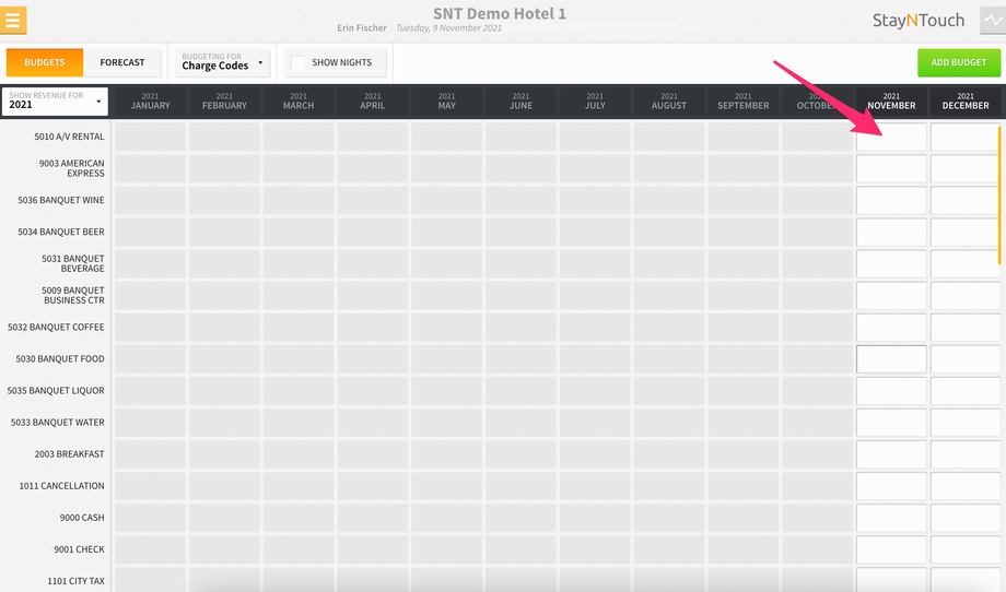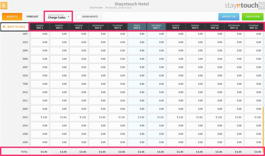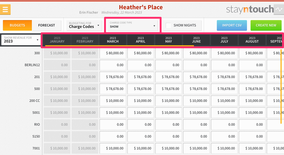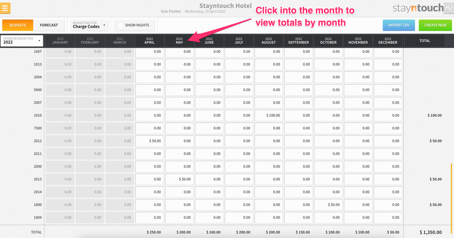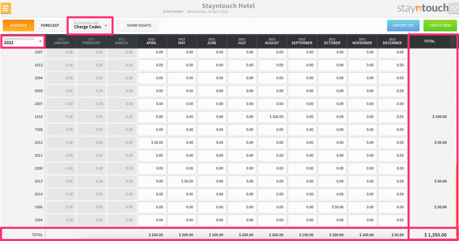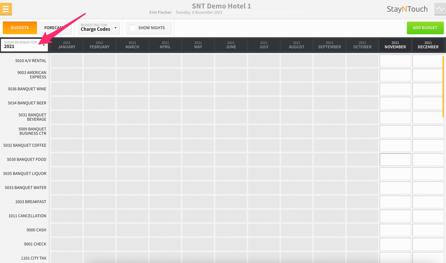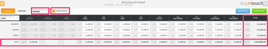 We display totals by charge code, market code, month, year, and day from Financials > Budgets. Totals also display when the SHOW NIGHTS checkbox is selected.