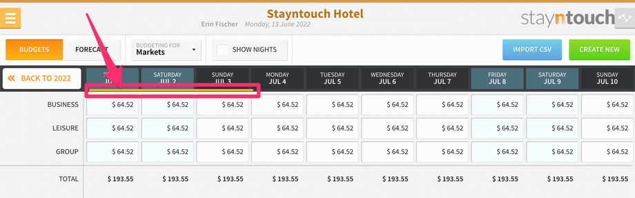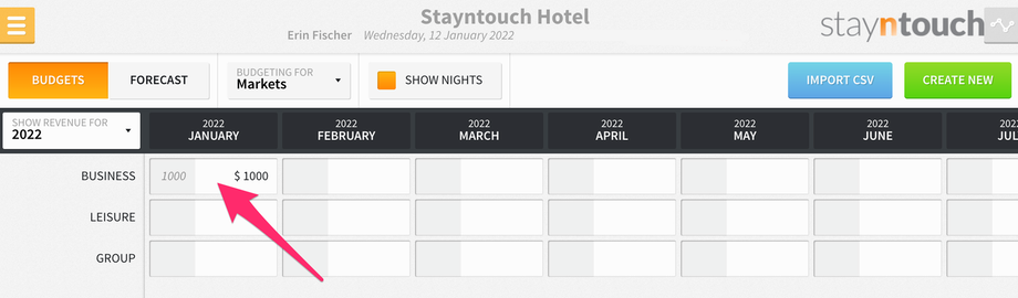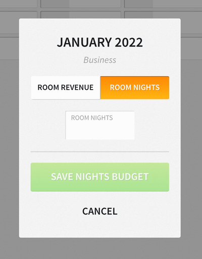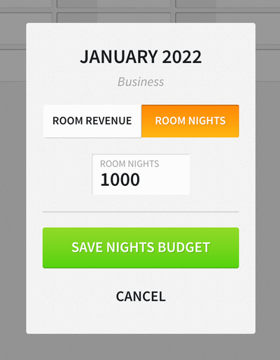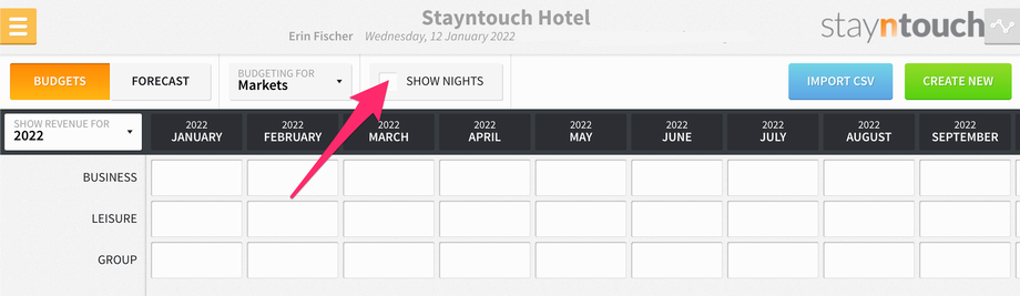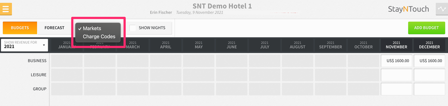 Furthermore, if you select the SHOW NIGHTS checkbox at the top of the screen, you can set budgets for projected nights for each market/charge code.