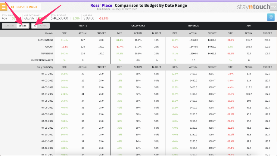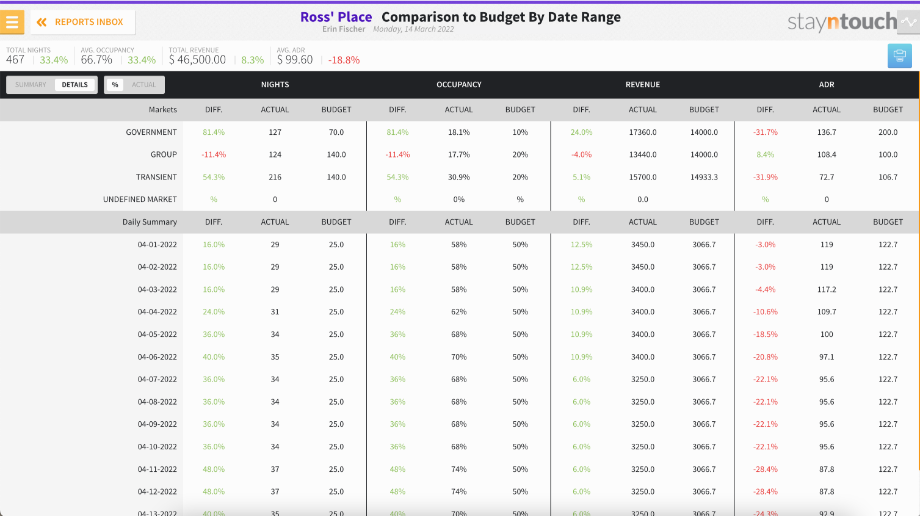 - DIFF. (as a currency amount): Actual room nights minus budgeted room nights for the date(s).