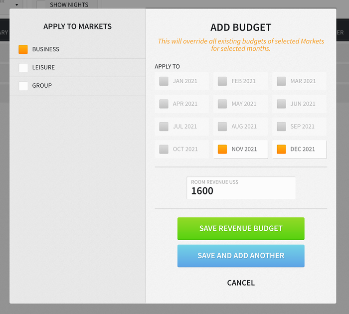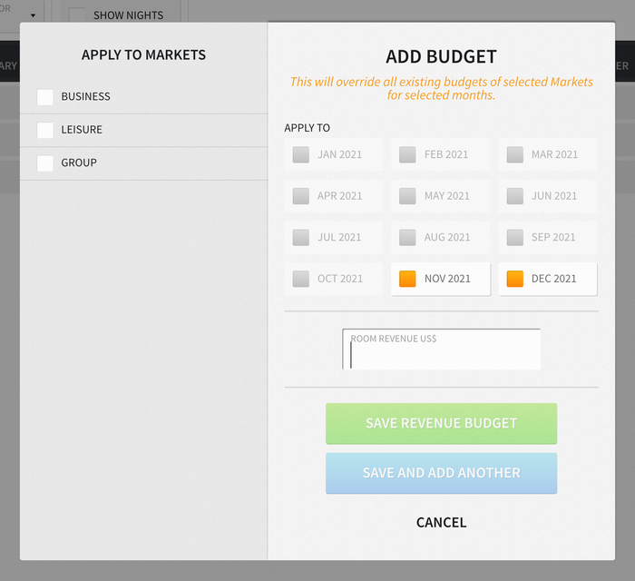 Furthermore, you can add numbers per month and charge code/market or apply a budget to multiple months and charge codes/markets by selecting the green ADD BUDGET button. If applying a budget to multiple months and charge codes/markets, you can click SAVE REVENUE BUDGET once complete, or you can click SAVE AND ADD ANOTHER to add another budget.