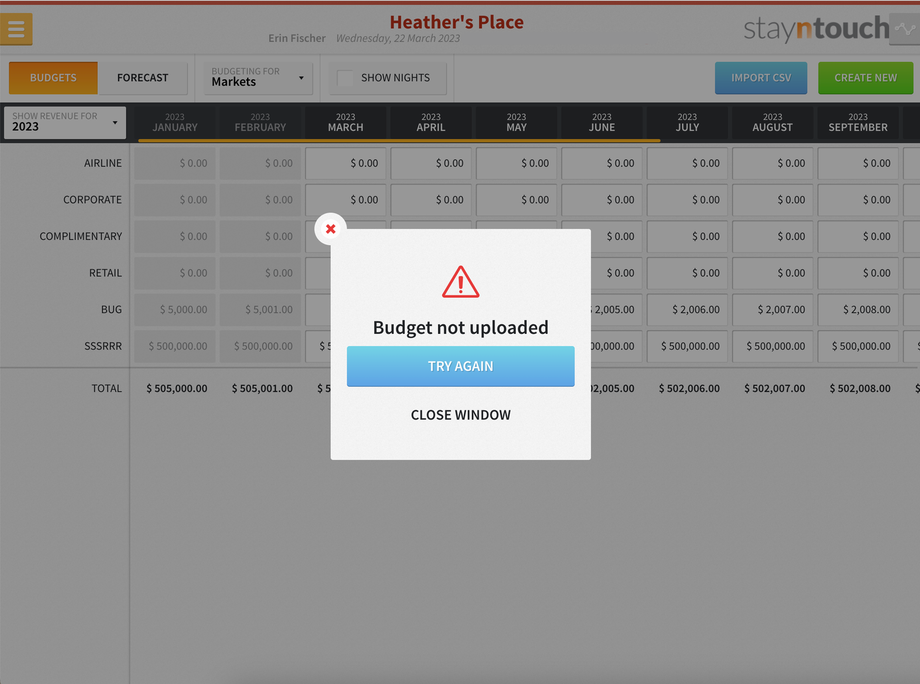 Upon importing a CSV file from Financials > Budgets, you will receive a “Budget not uploaded” message (see screenshot below) if the header field names are empty.