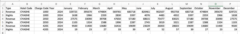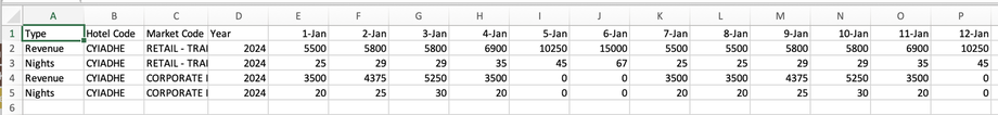 - Column A should always be labeled "Type", and the row labels should be "Revenue" and "Nights".