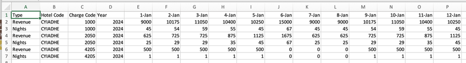 - Columns E through the end should have the by day or by month column headers listed below. If you are not importing the full year, you should only have column headers for the months or days you are importing.